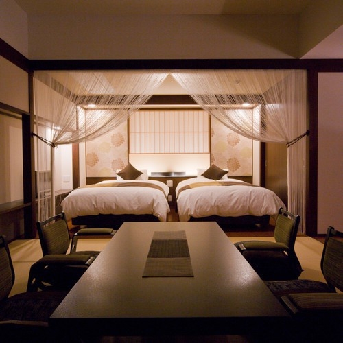 ○和室10畳にシモンズ社製のセミダブルツインベッド(客室の広さ57.1㎡)