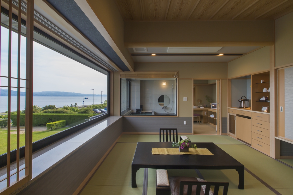 【風呂満喫】3階「MINAMO」は、みなもに風が描くやわらかな波の美しさやただよう水鳥、みなもに舞う花などの宍道湖の自然美を同じ空間で一緒に過ごすお客様にご堪能いただくために意匠いたしました。新客室の露天風呂付和洋室には、松江しんじ湖温泉を給湯し、宍道湖を一望する露天風呂がございます。信楽焼浴槽でおふたりでもゆったりご入浴いただけます。宍道湖に面した大きな窓ガラスからは、時間によって異なる美しい水辺の景色を望むことができます。上質なしつらえのスタイリッシュな新客室では、ブルーレイプレイヤーや携帯音楽端末も接続できるシアターサウンドシステム、シモンズ社製のセミダブルツインベッド、洗練されたアメニティセットとシャワーブースなどお客様のリラックスタイムをお過ごしください。