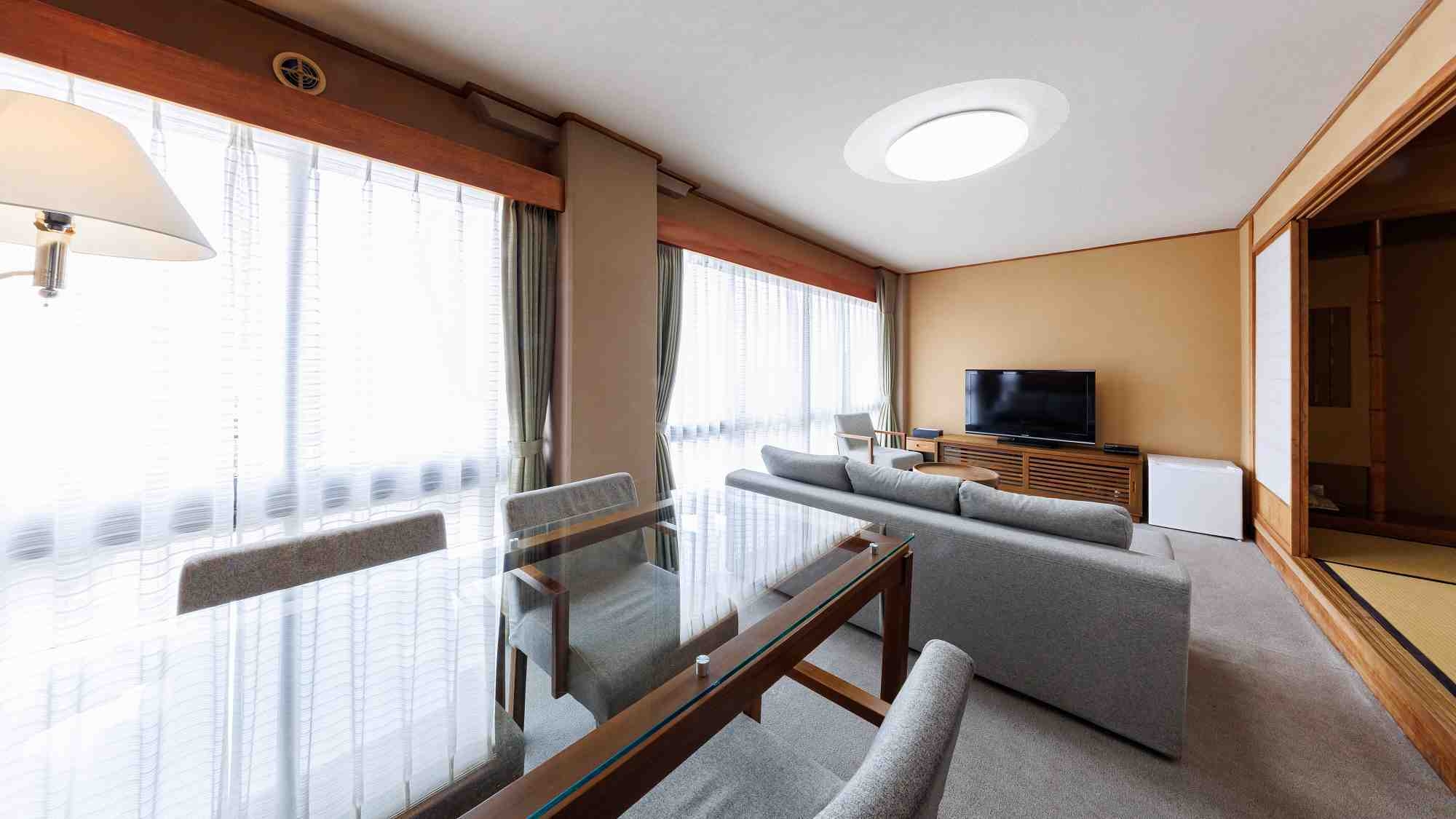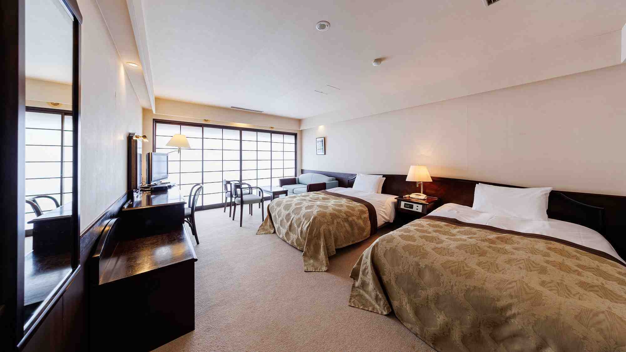 和室8畳とツインベッドルーム(洋室約12畳、ベッドサイズ120×190)を備えた和洋室 ■バス・シャワートイレ付 ■天然温泉を給湯 ■加湿空気清浄機