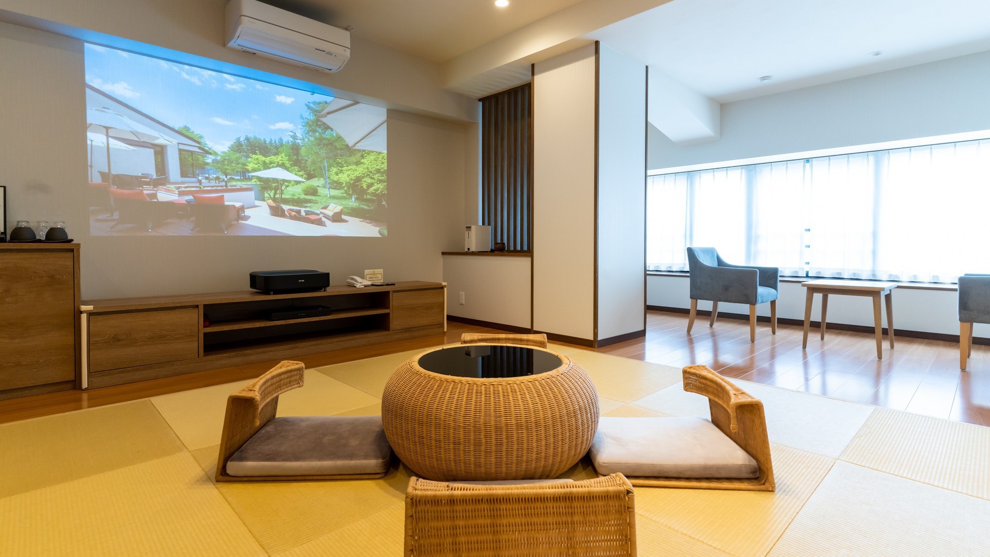2019年新設の新しいおしゃれな和洋室(バスなし)べッド2台+リビング。100インチスクリーンを備えるシアタールーム。テレビだけでなくYoutubeも視聴可。