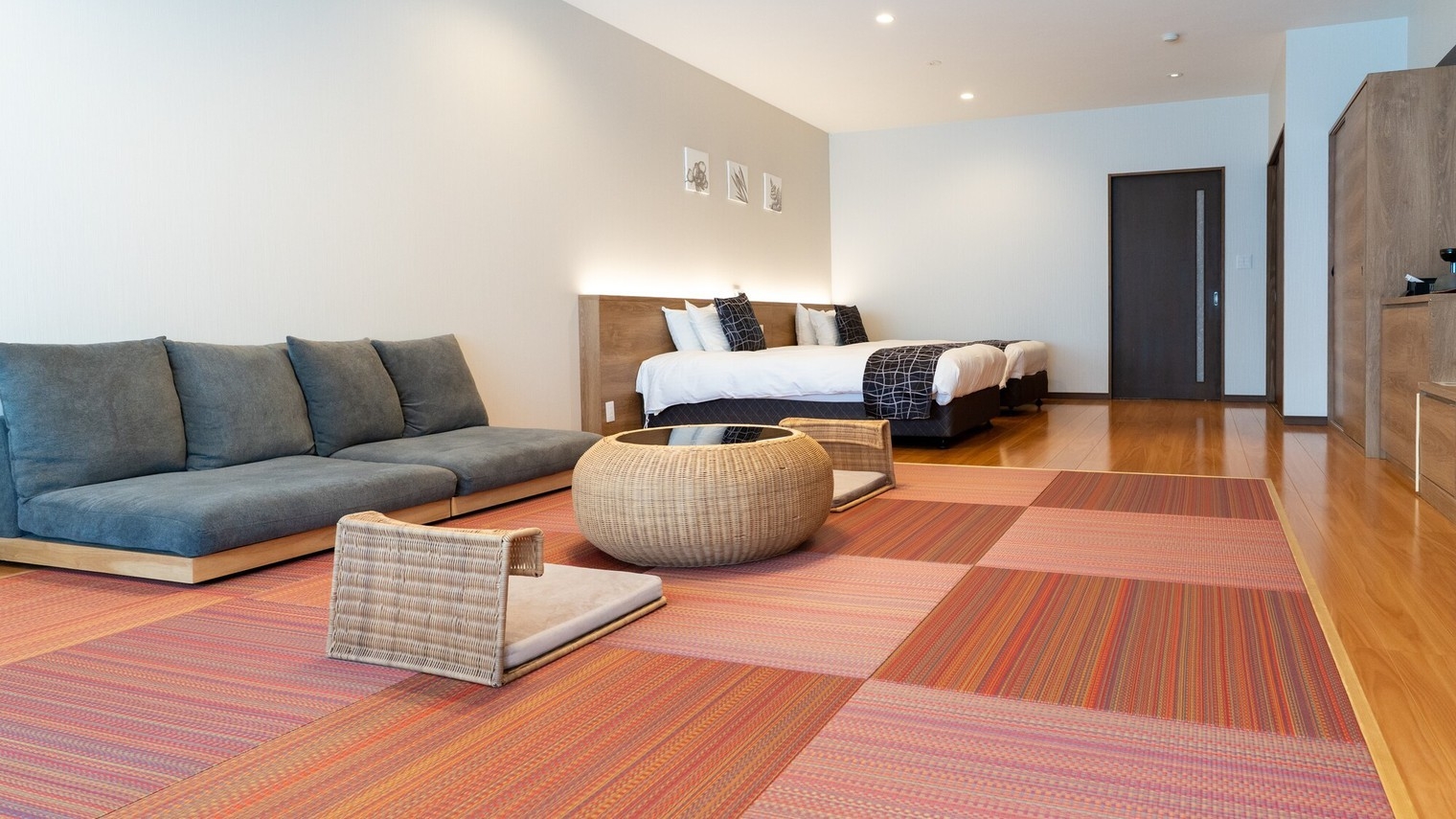 幼児(トドラー)連れのファミリー向け客室。和室に広々キングサイズ(幅180センチ)ローベッド1台。大人2名又は大人2幼児1名様で利用をおすすめします。