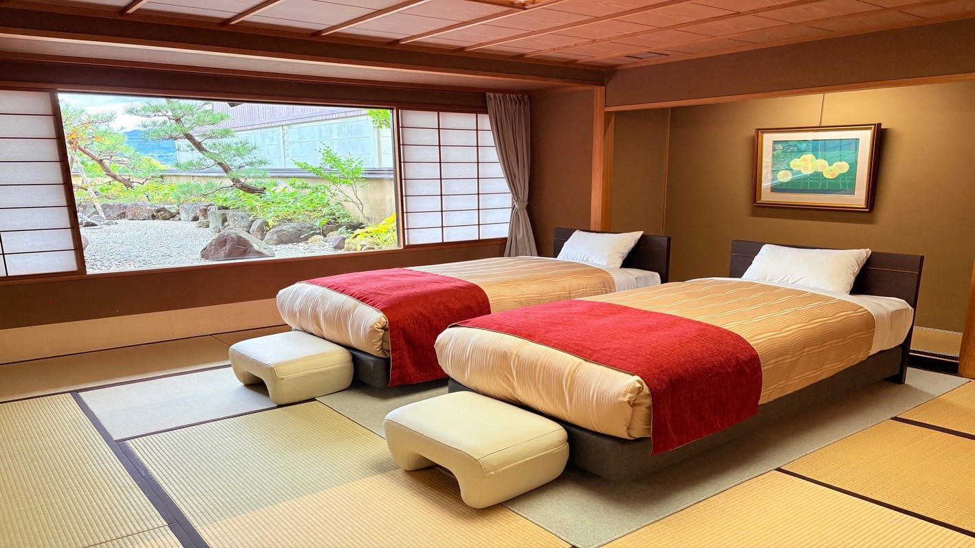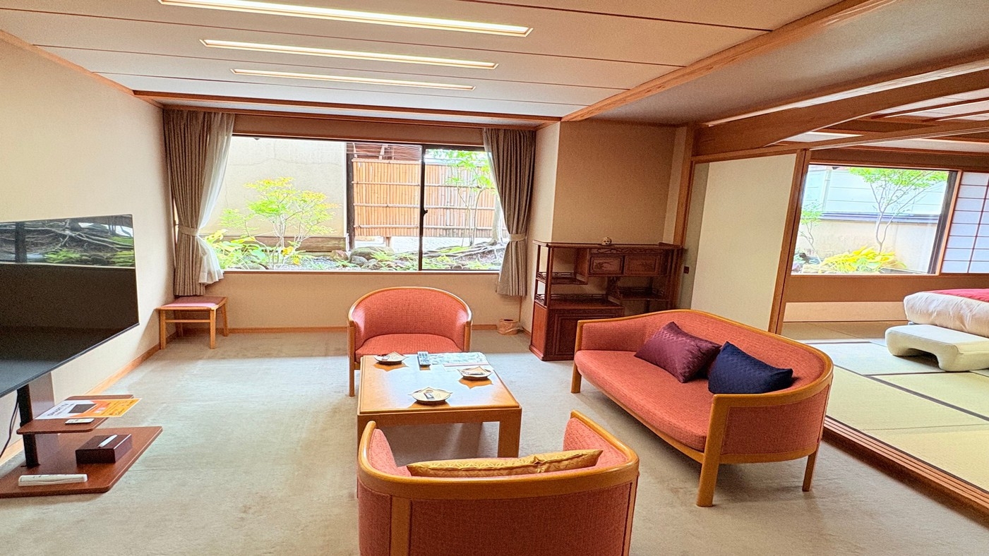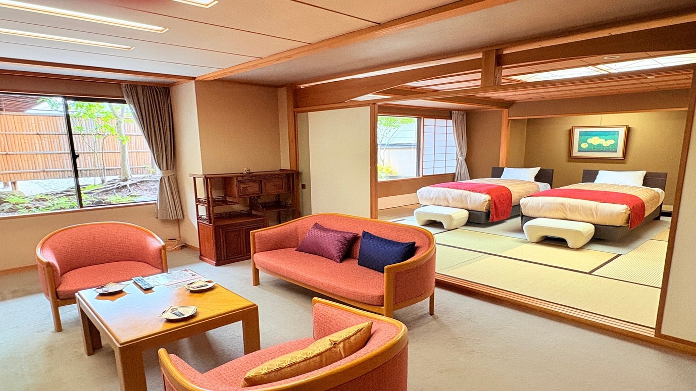 本丸の特別和洋室は四季折々の自慢の庭園を一望するお部屋。館内のご移動に少し距離がございます。間取り:和室12.5畳+リビング+ツインベッドルーム/定員6名様迄