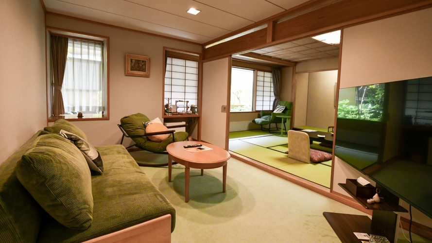 当館の本丸棟、最も静かな角部屋のお部屋です。 庭園に面したテラスには椅子テーブルを備えており 季節の良い時は、テラスで一杯、など心地よい時間を 過ごして頂ける人