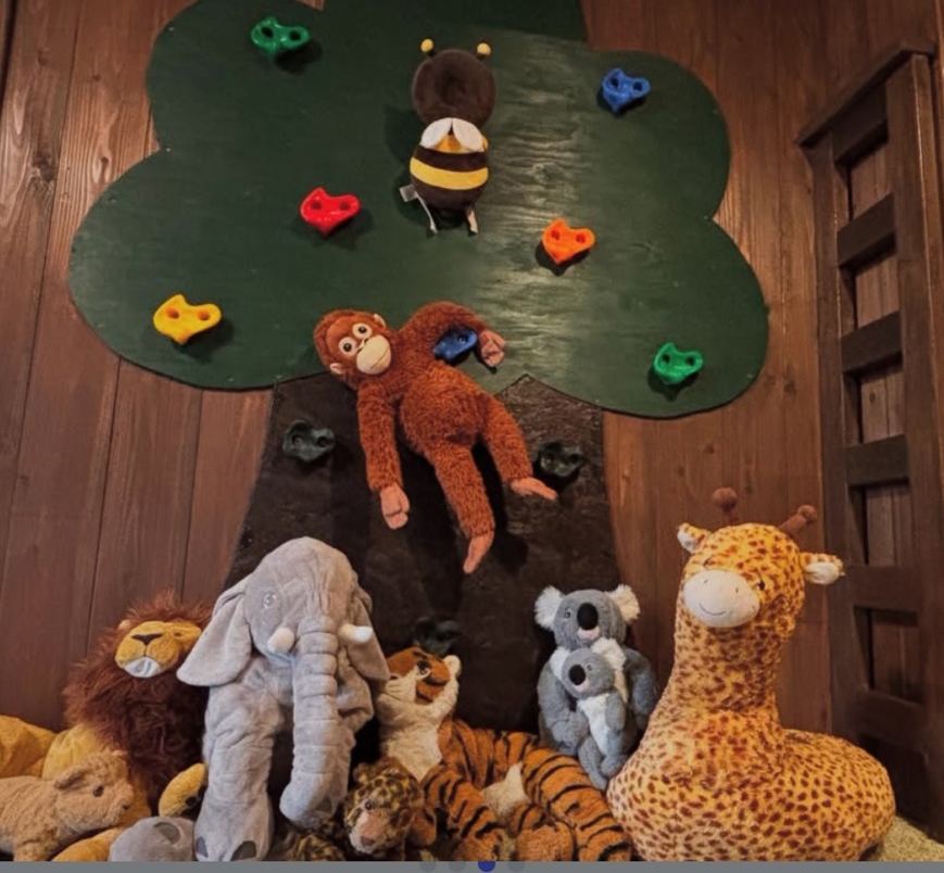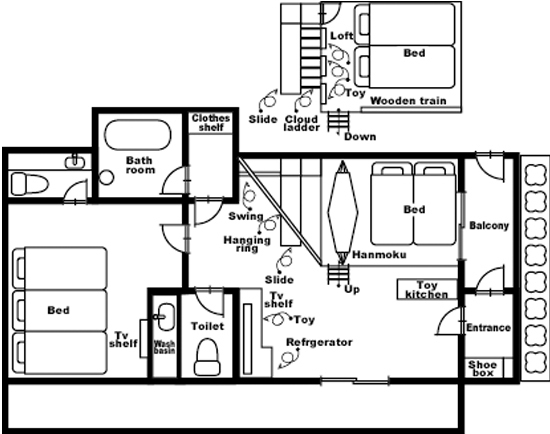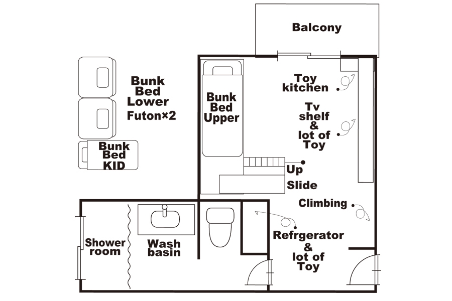 すべり台、クライミング、猫足バスルーム、ベット2台、お子様用2段ベット(160CMのお子様専用)の4名部屋、大人2名+お子様2名+添い寝2名まで