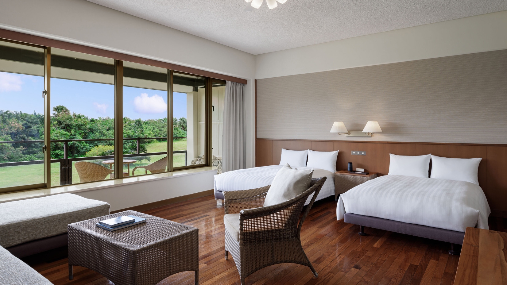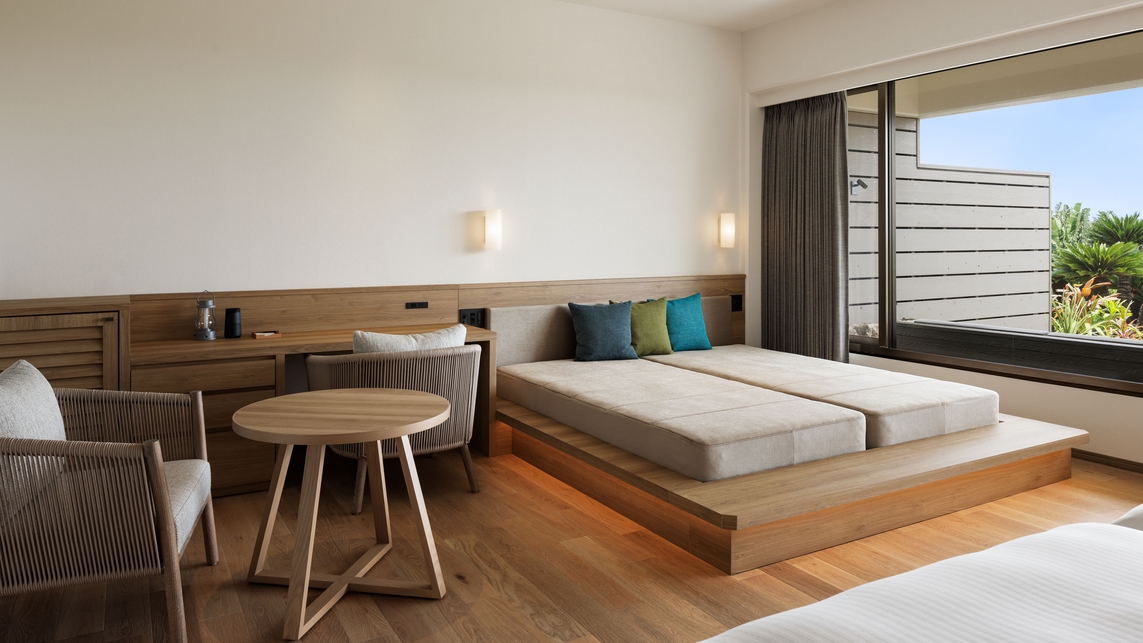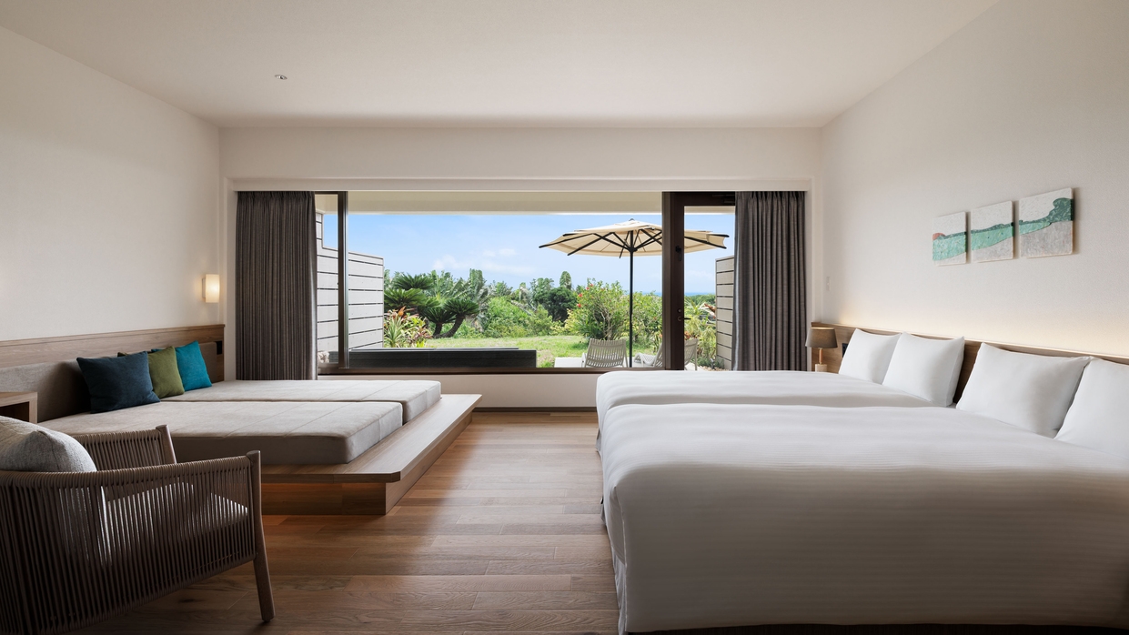 客室47平米+テラス10平米(定員4名)【室内・テラスともに禁煙】※客室を3〜4名利用の際には、+ソファーをシングルベッド(幅100×長さ195cm)にして使用