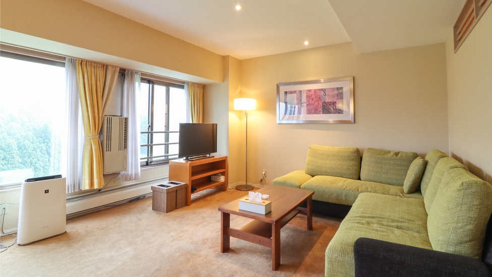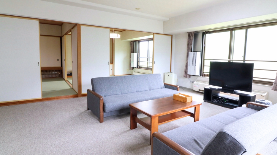 お子様連れのご旅行に便利な子育て応援グッズがセットされているお部屋。和室1部屋+洋室1部屋(ツインベッド付)+リビング付、バス・洗浄機付トイレ完備。