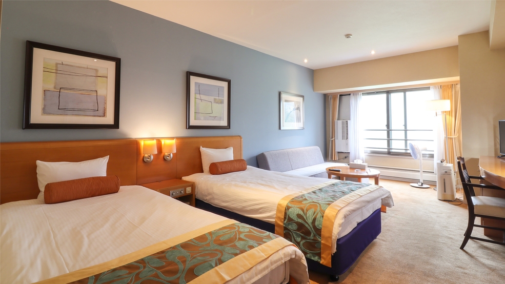 山側・高層階に位置する上質な空間が演出されているお部屋。ハリウッドサイズのベット、ゆったりとしたソファースペースのあるお部屋でくつろぎの空間を演出。