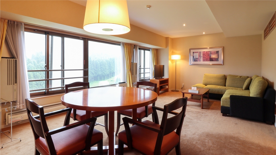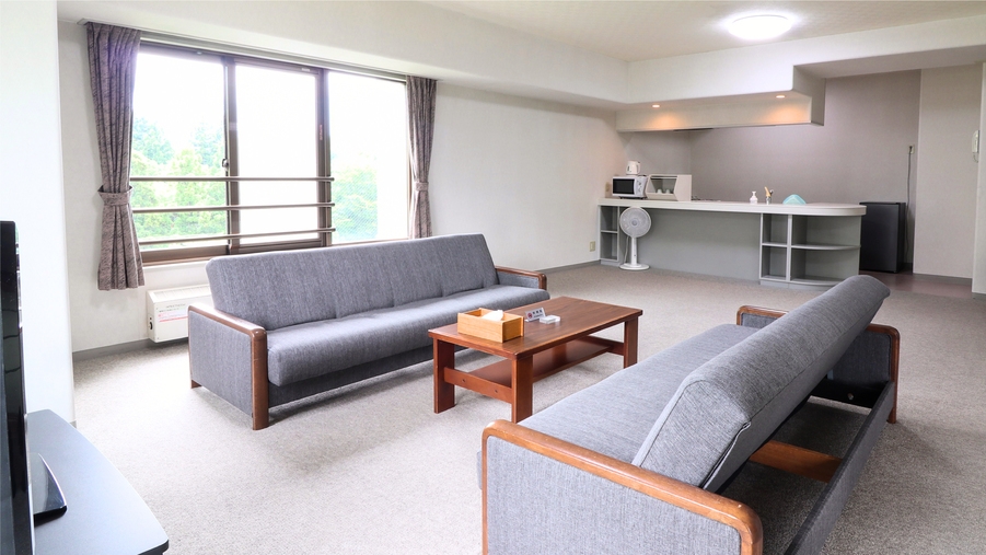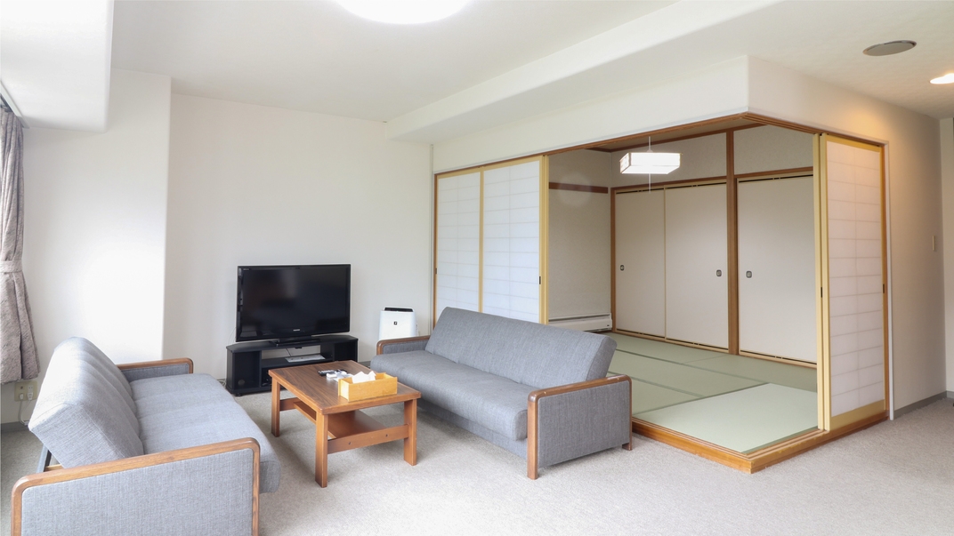 お子様連れのご旅行に便利な子育て応援グッズがセットされているお部屋。和室1部屋+洋室1部屋(ダブルベッド1台付)+リビング付、バス・洗浄機付トイレ完備。