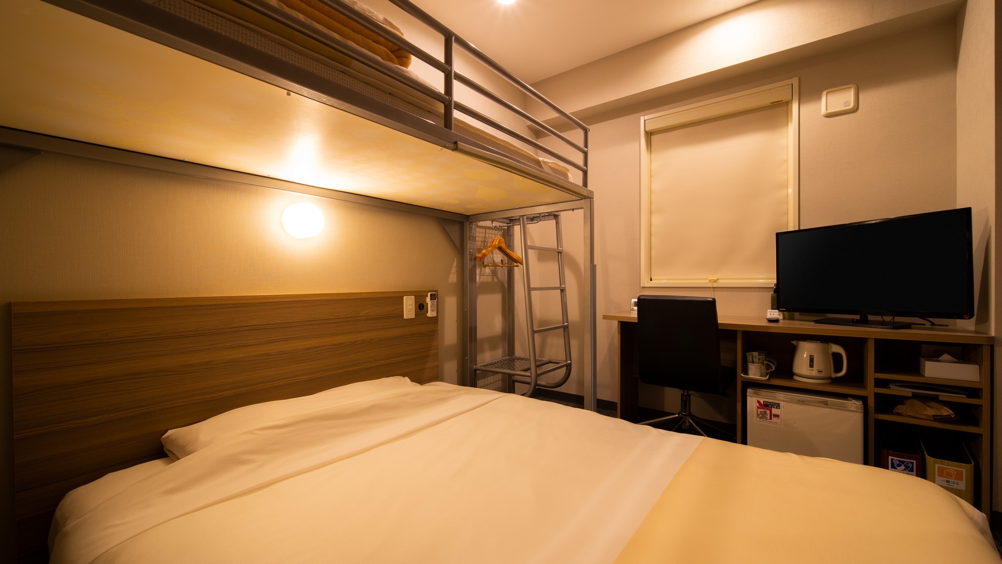 ダブルサイズのワイドベッドとお子様に人気のロフトベッド付の【スーパールーム】です。 ご家族にお勧めです。