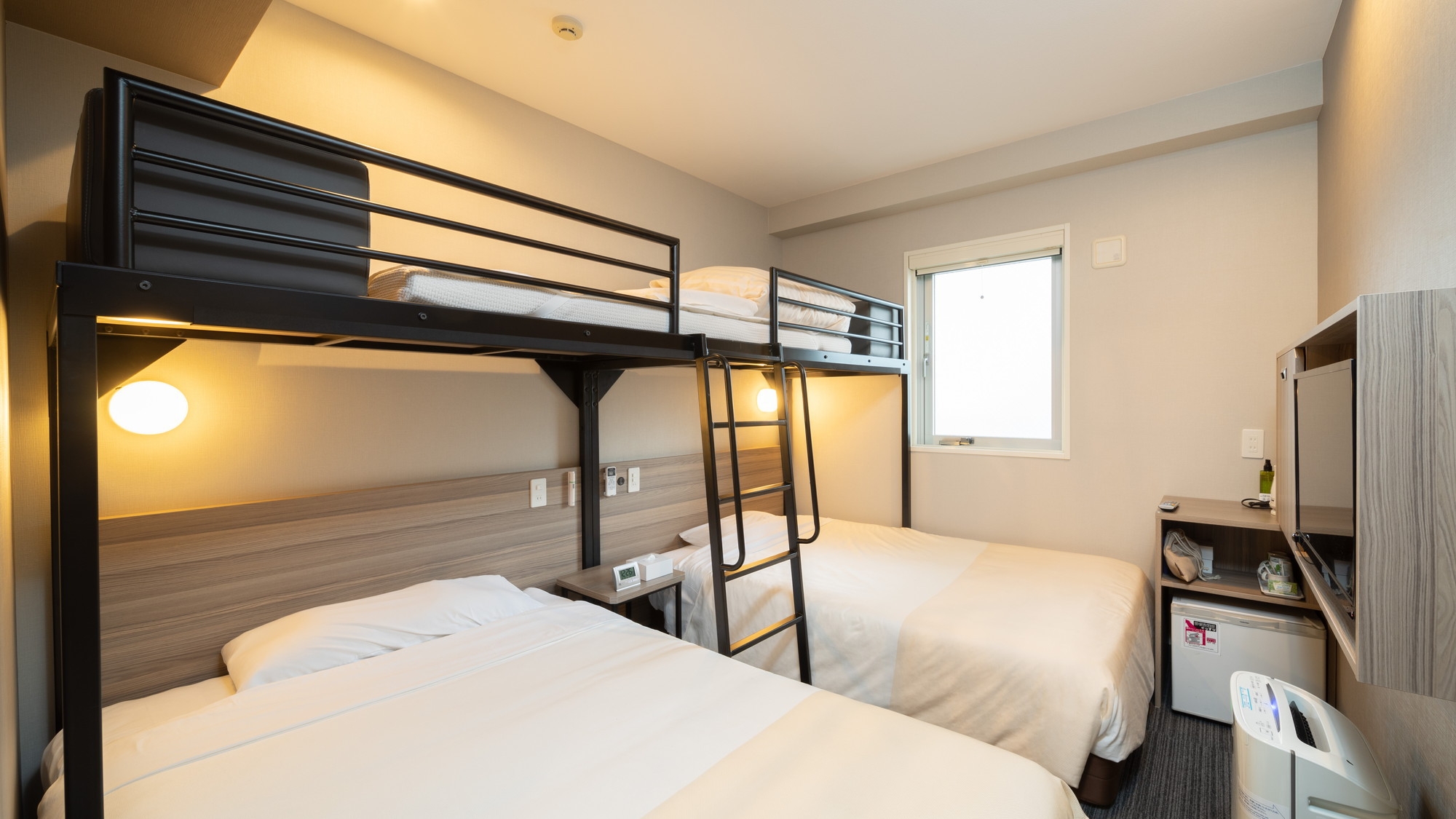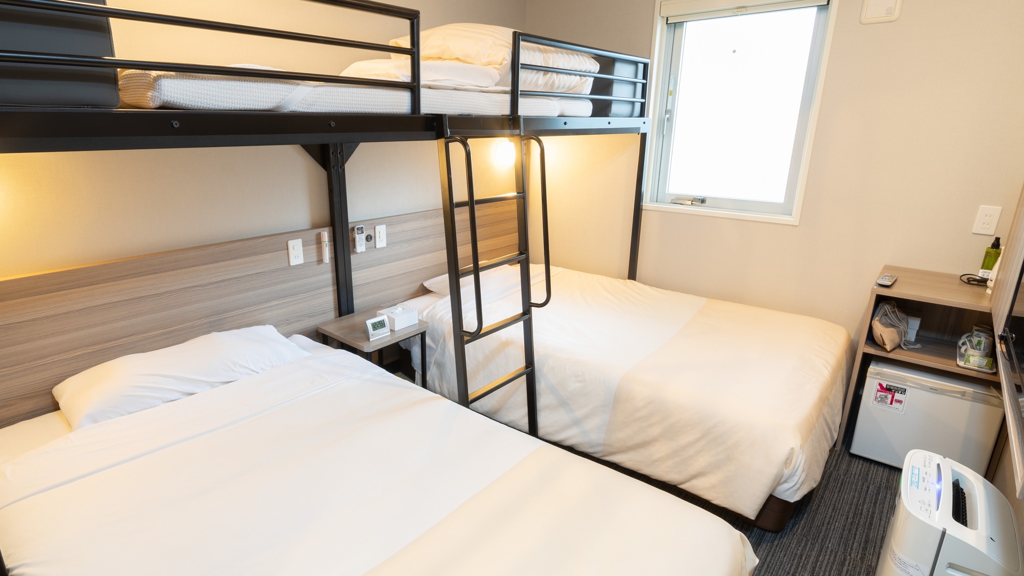 定員5名までお泊り頂ける【トリプルルーム】です。 120cm幅のセミダブルベッドが2台と、90cm幅のロフトベッドが1台あるお部屋で、ご家族などにお勧めです。