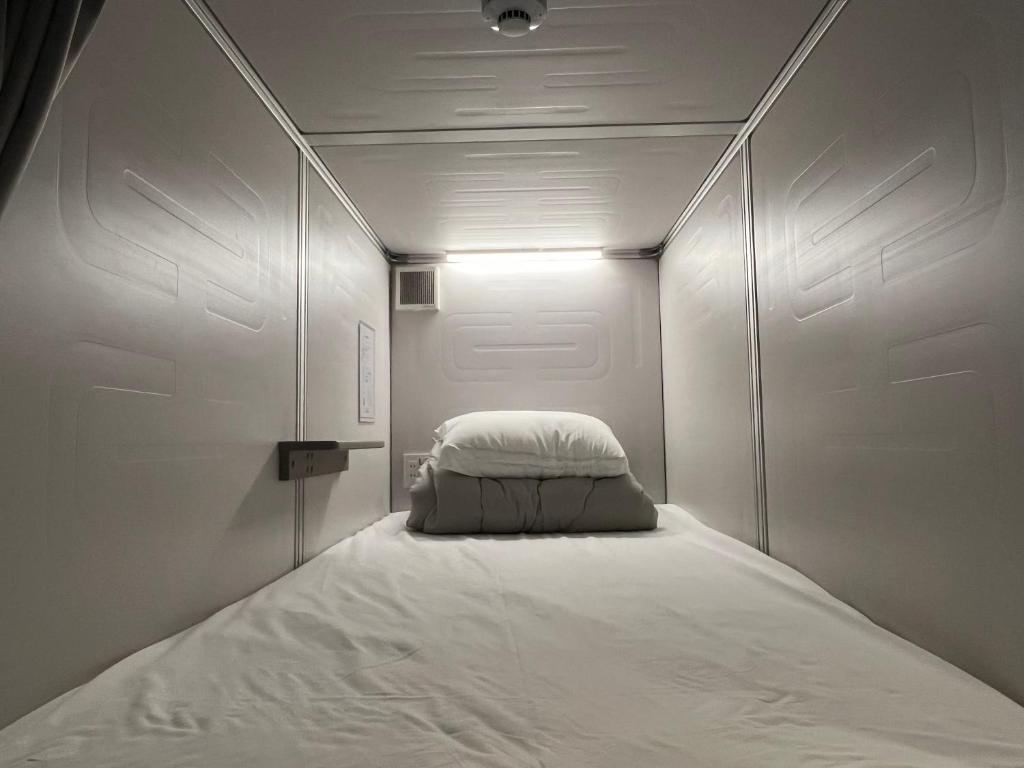 カプセルホテルタイプのベッド。共有シャワー、トイレ、荷物置き場。専用ロッカーあり