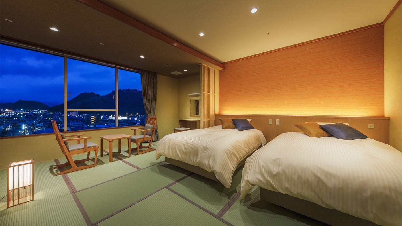 120cmセミダブルベッド2台を配した12畳の和室。シャワールーム付。高層7・8階で天童の夜景を一望!