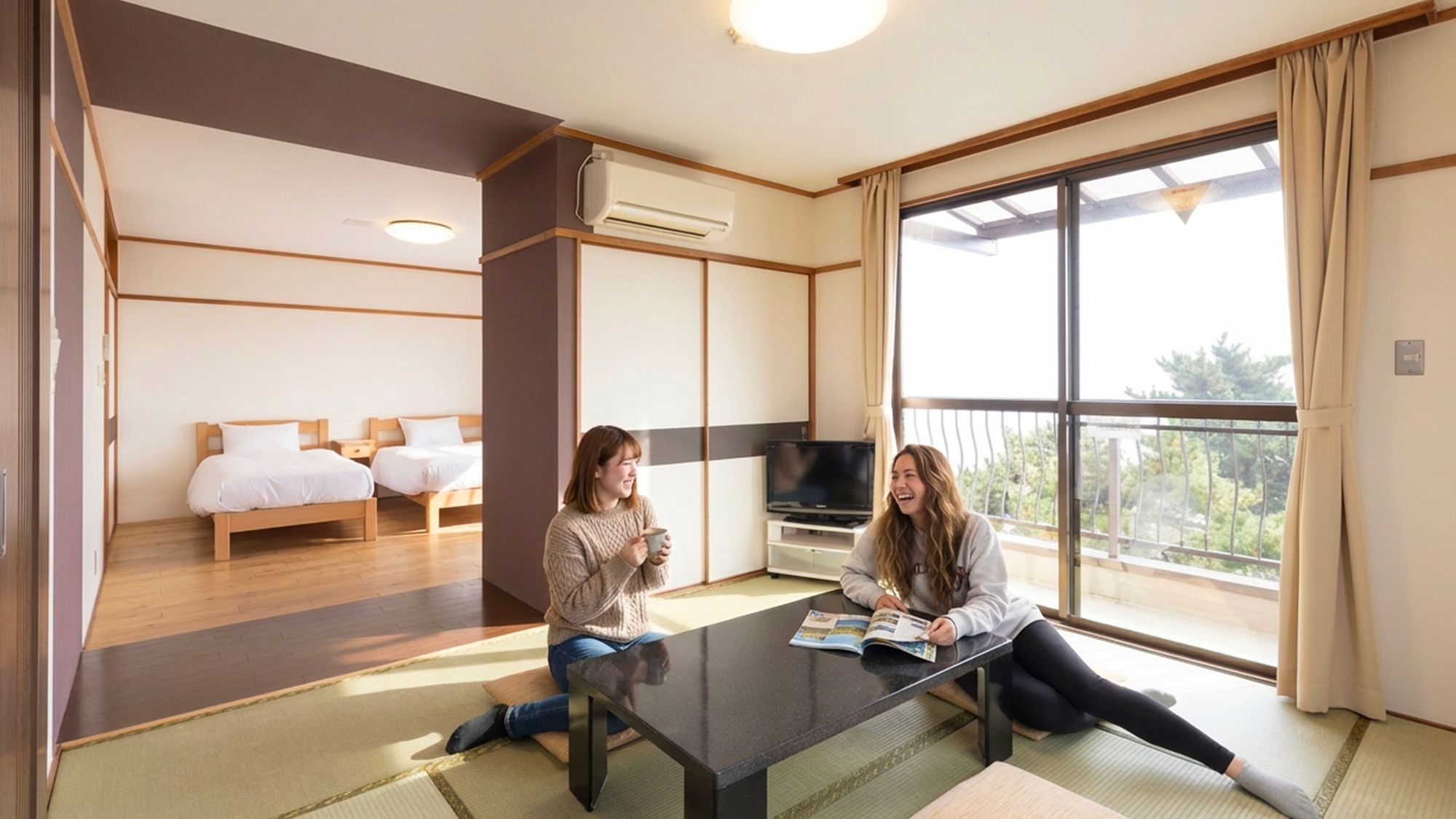 シングル・セミダブルのベッド2台+畳。フロア内に専用トイレ・男女別共用浴場利用可能。