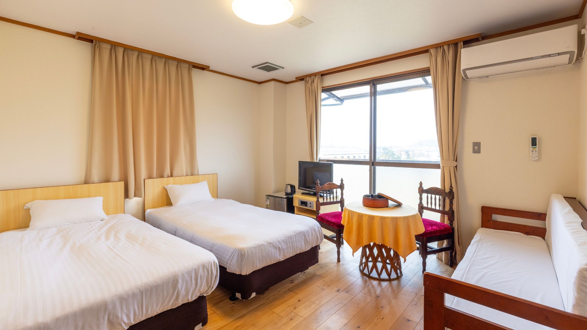 [客室]バスルーム、トイレ、洗面台、シングルベッド1台、セミダブルベッド1台(3名様以上の場合、人数分の布団一式ご用意)