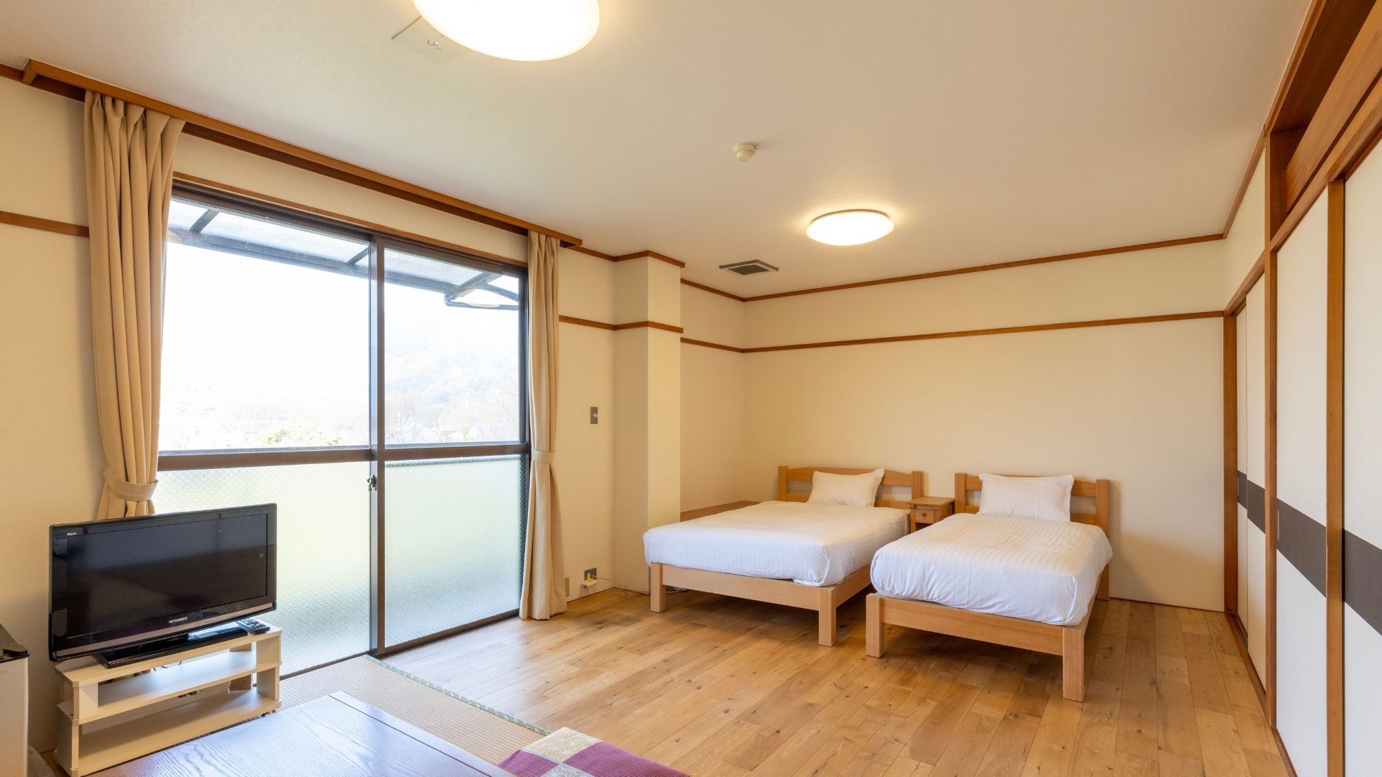 【禁煙】シングル、セミダブル2台のベット+畳。室内専用トイレ・男女別共用浴場利用可能。