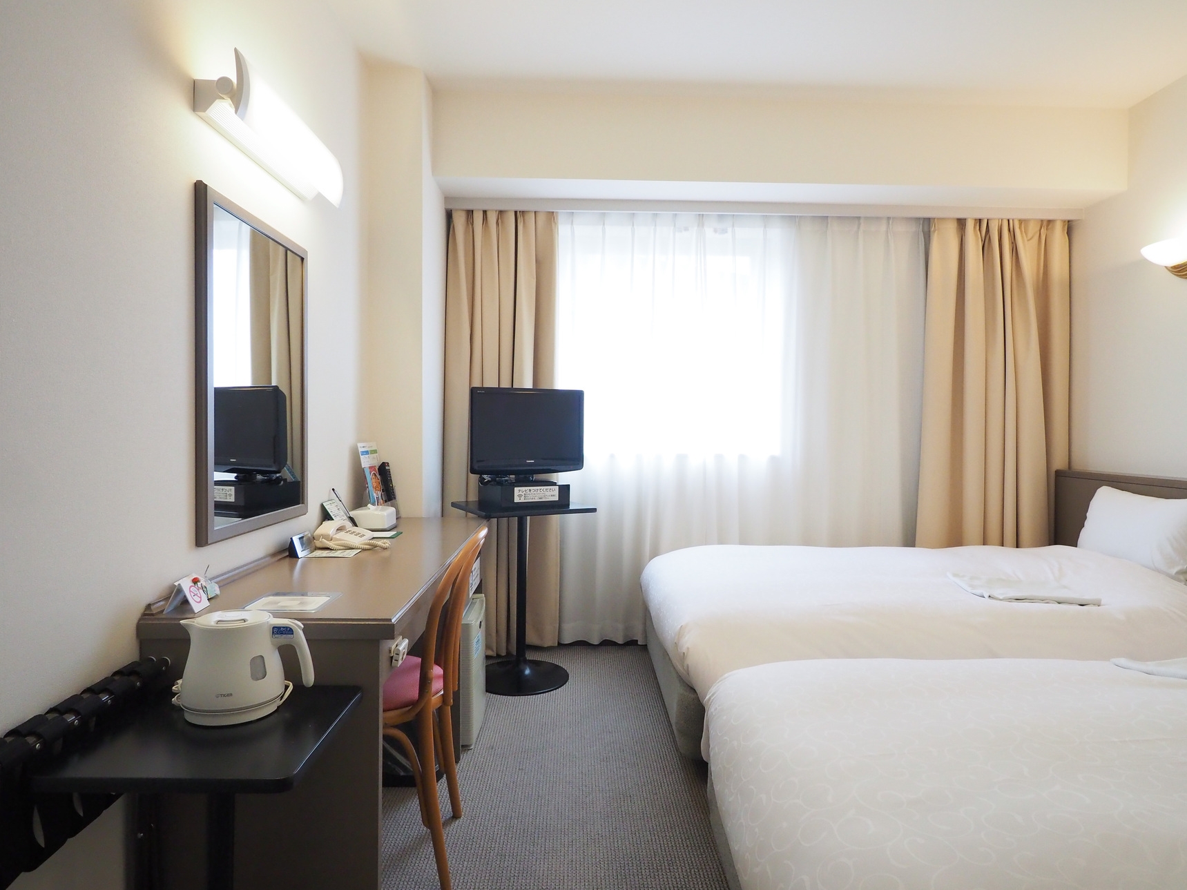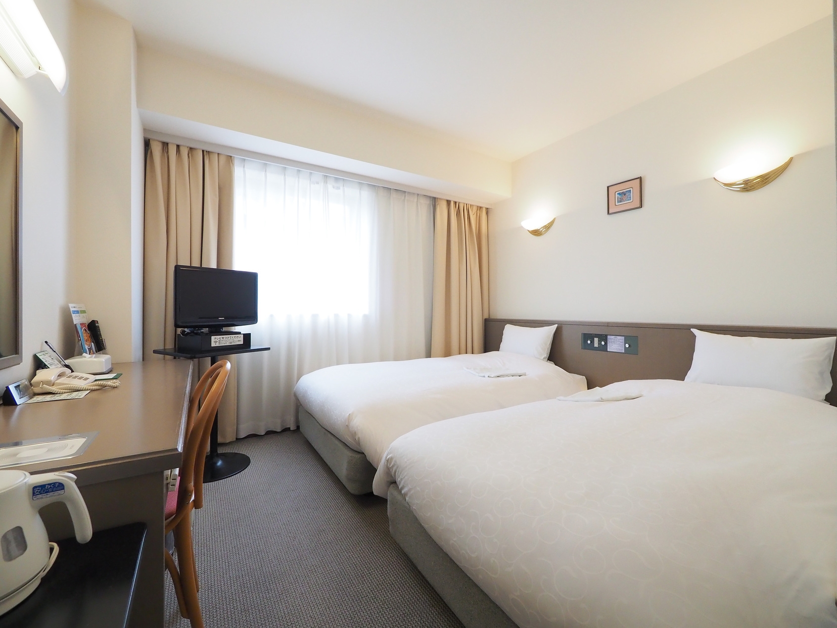 18平米のゆとりある空間に、135センチ幅のベッドを2台配したツインルームです。
