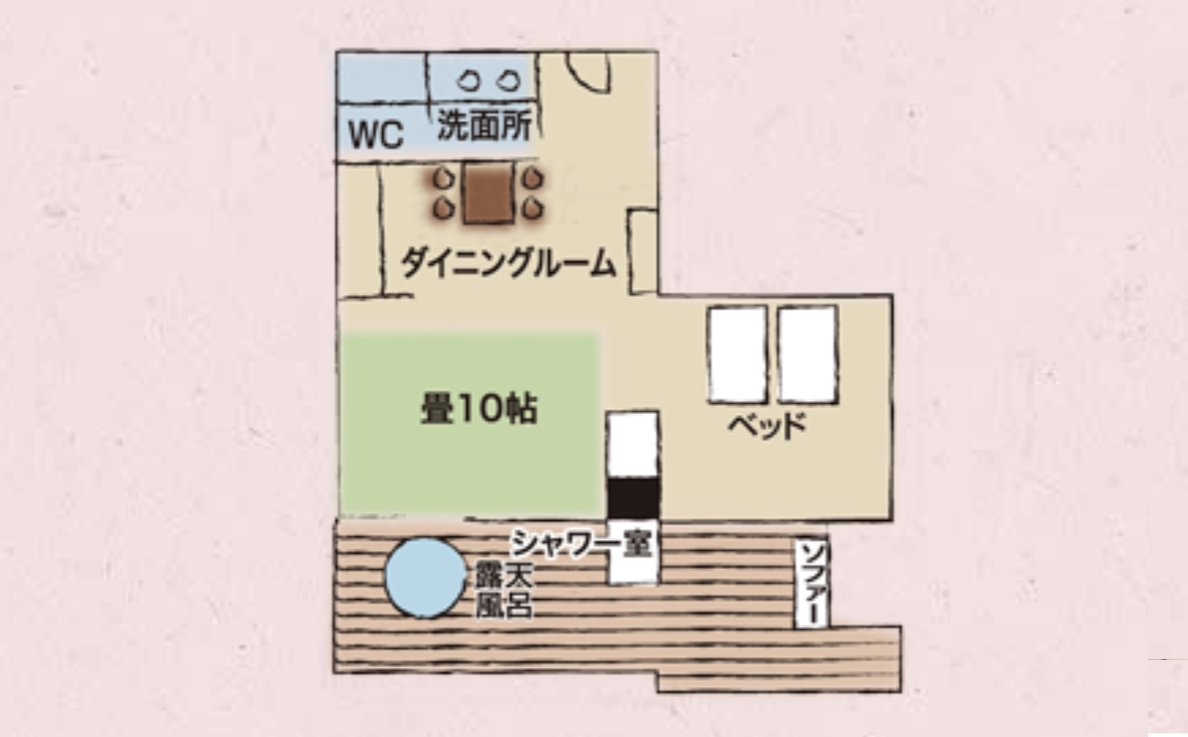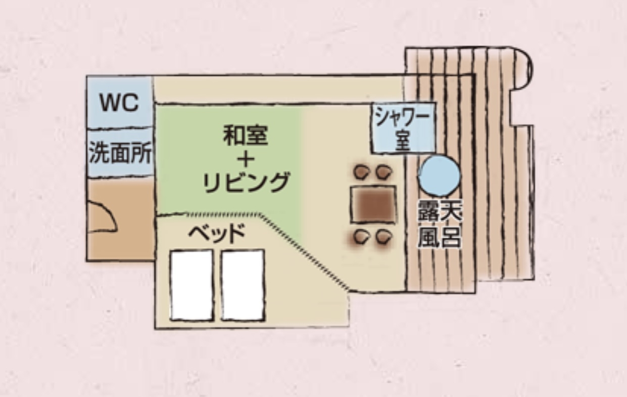 2024年3月オープン!ダイニングとベッドルームが分かれたお部屋。 ※露天風呂は温泉ではなく、伊香保の山より湧出たミネラル豊富な天然水を沸かし使用しております。