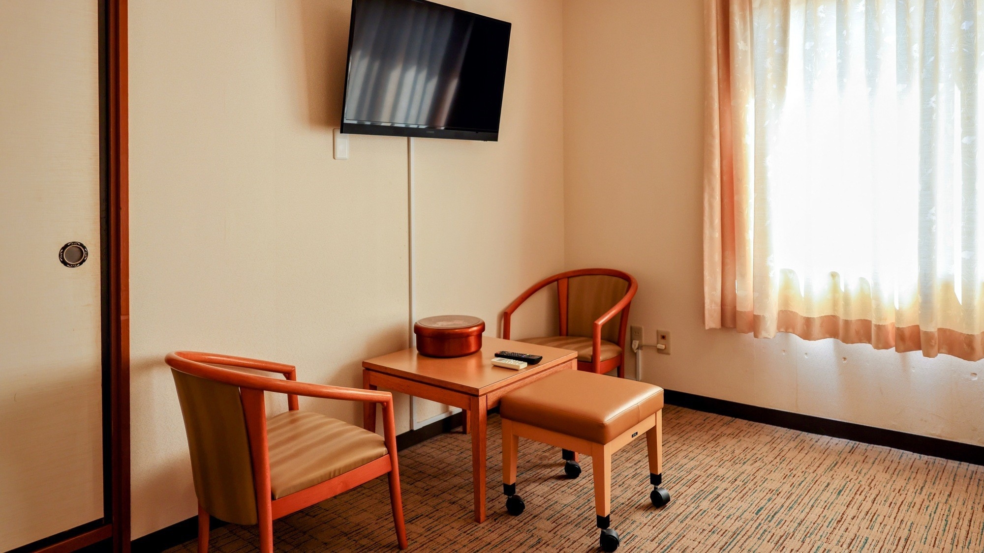 ベッドを1台完備したコンパクトな和洋室。43インチ大型テレビ、Wi-Fi完備。