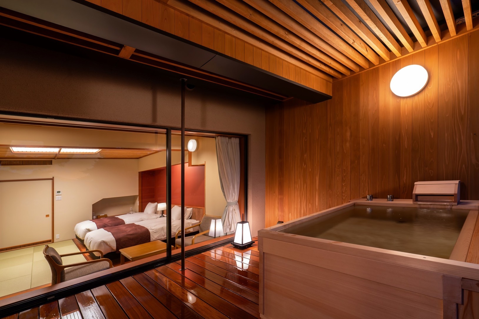 館内初の露天風呂付き和室ツイン。趣深い雅な和室に露天風呂をご用意致しました!3名様でご利用の場合、お布団を1名様分追加でご用意させていただきます。