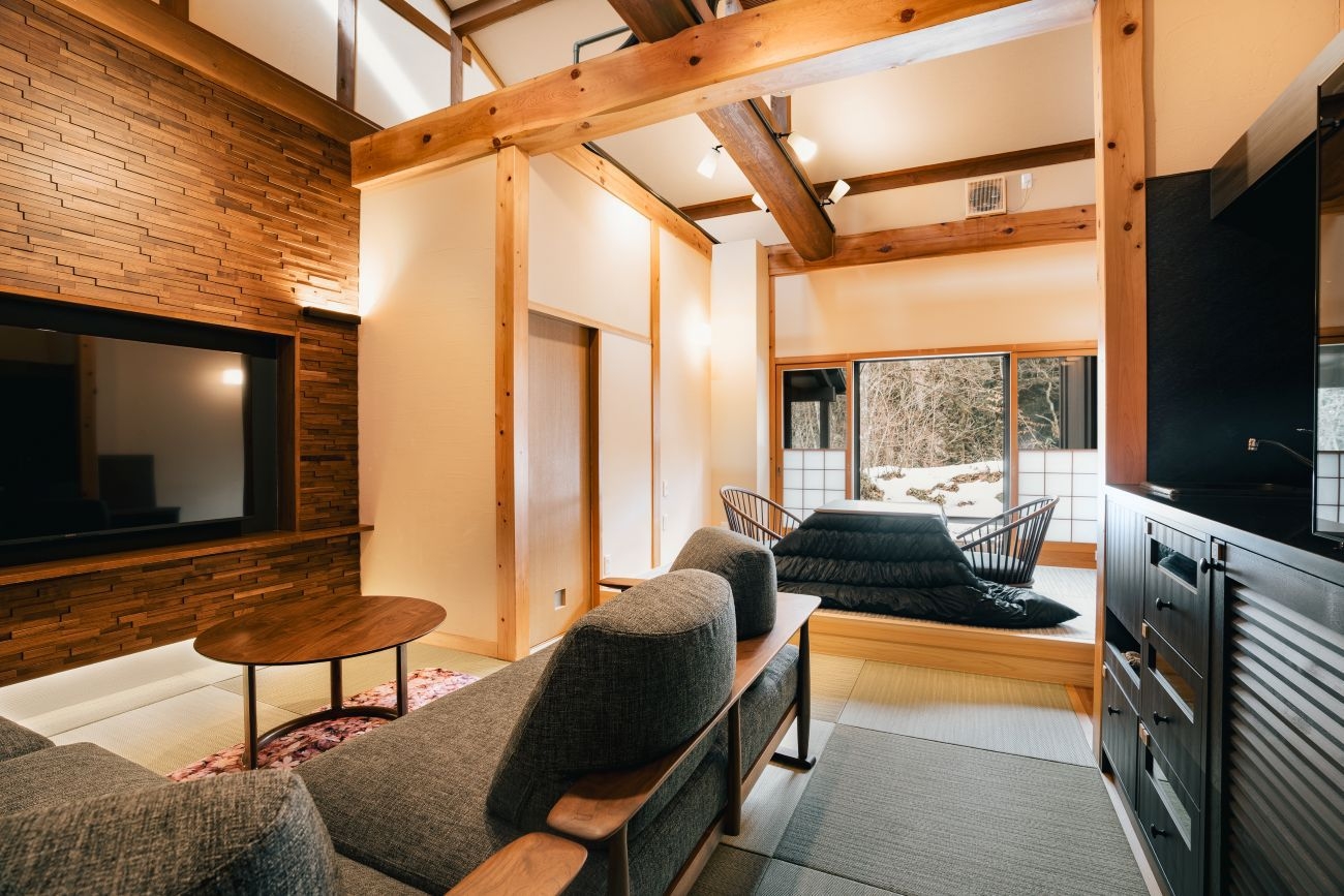 立派な梁と大胆な木組みといった、 飛騨の建築技術を用いた開放的な寛ぎの空間。テラスにある檜造りの露天風呂では、 源泉掛け流しの温泉をお愉しみいただけます。