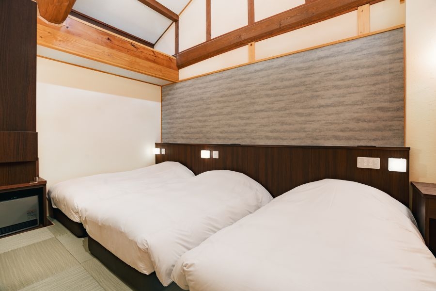 和の障子をあしらった洋室に、シモンズ社の洋式ベッドを2台ご準備しております。お部屋のお風呂はユニットバスです。洗面所とトイレは、バリアフリータイプでご用意。