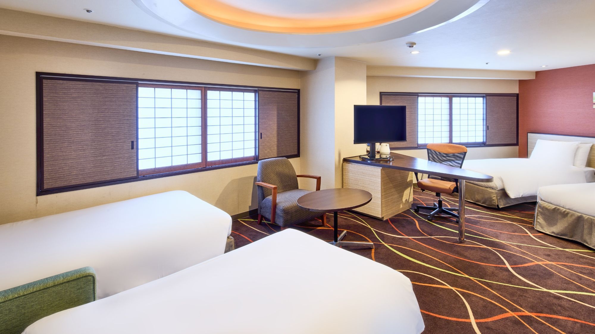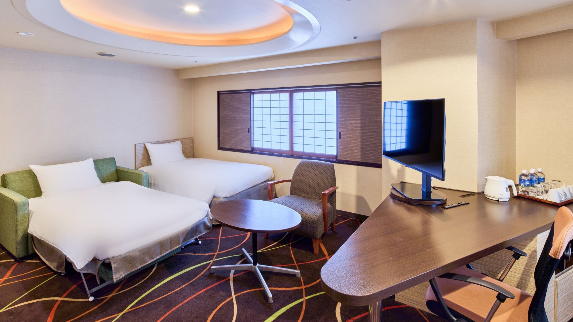 お部屋は28平米。高速インターネット(Wi-Fi)完備。ツインベッド+ソファベッド+ハイダーベッドとなります。