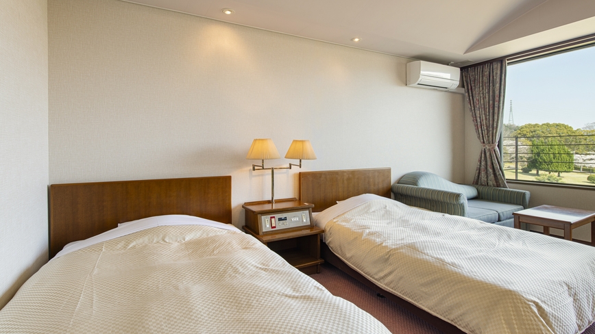 こちらのお部屋は<禁煙>のお部屋です。豊かな自然を眺めながらのんびりお過ごしいただけます。ベッドは快適な寝心地のシモンズ製です。