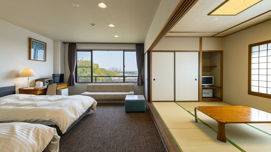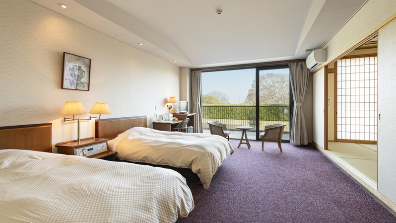 ベッドで休みたいけど足を伸ばしてくつろぎたい。そんな要望を叶える和洋室タイプのお部屋です。ベッドは快適な寝心地のシモンズ製です。
