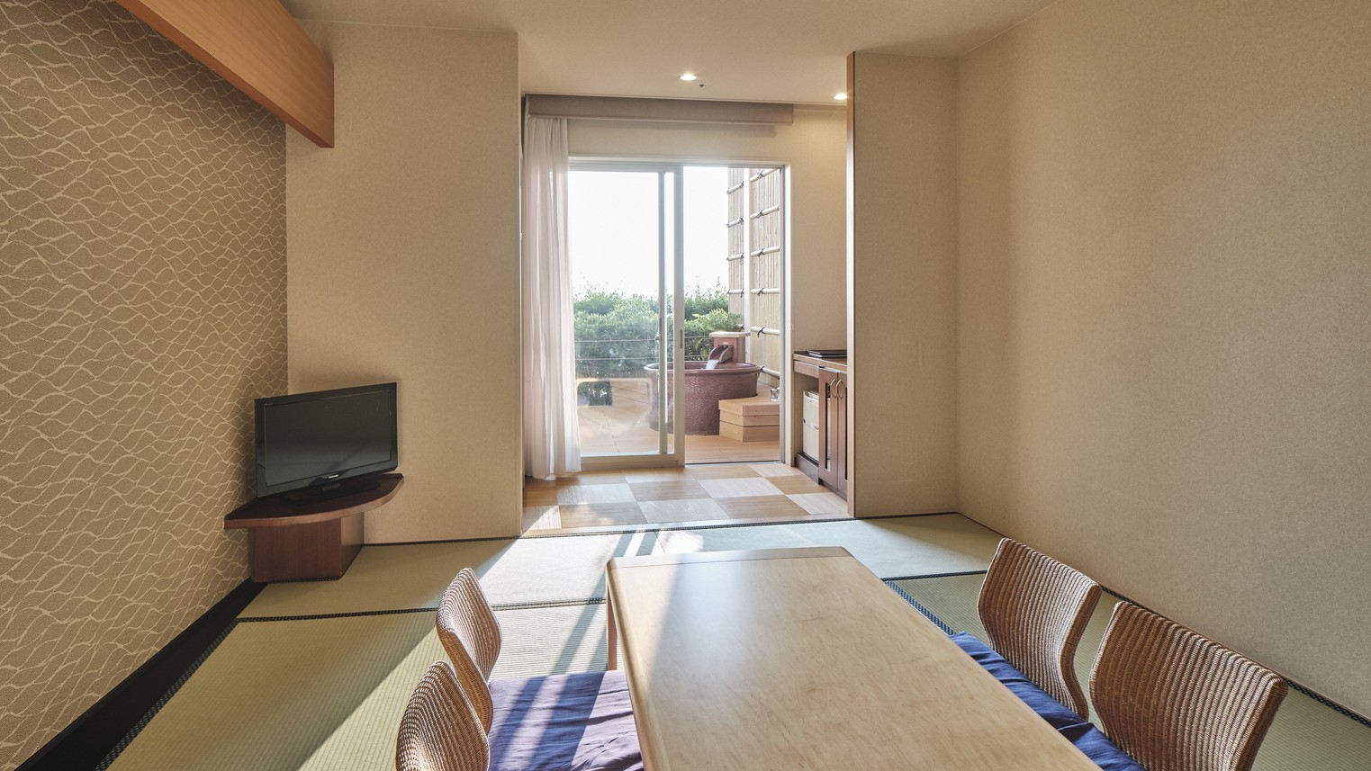 客室デッキに露天風呂がついた約10畳の和室。最大4名まで宿泊可能です。※露天風呂のお湯は、温泉水ではございません。