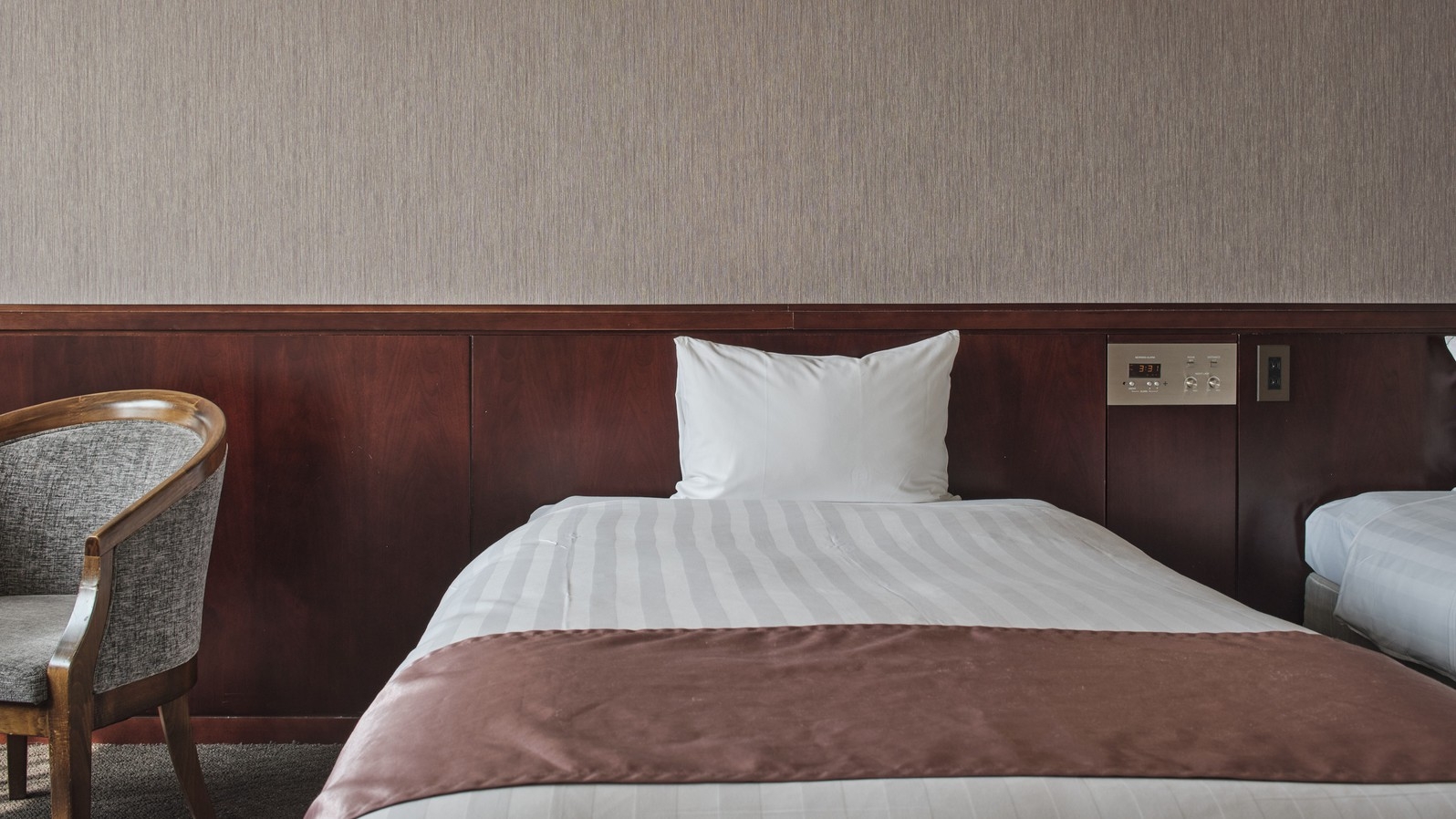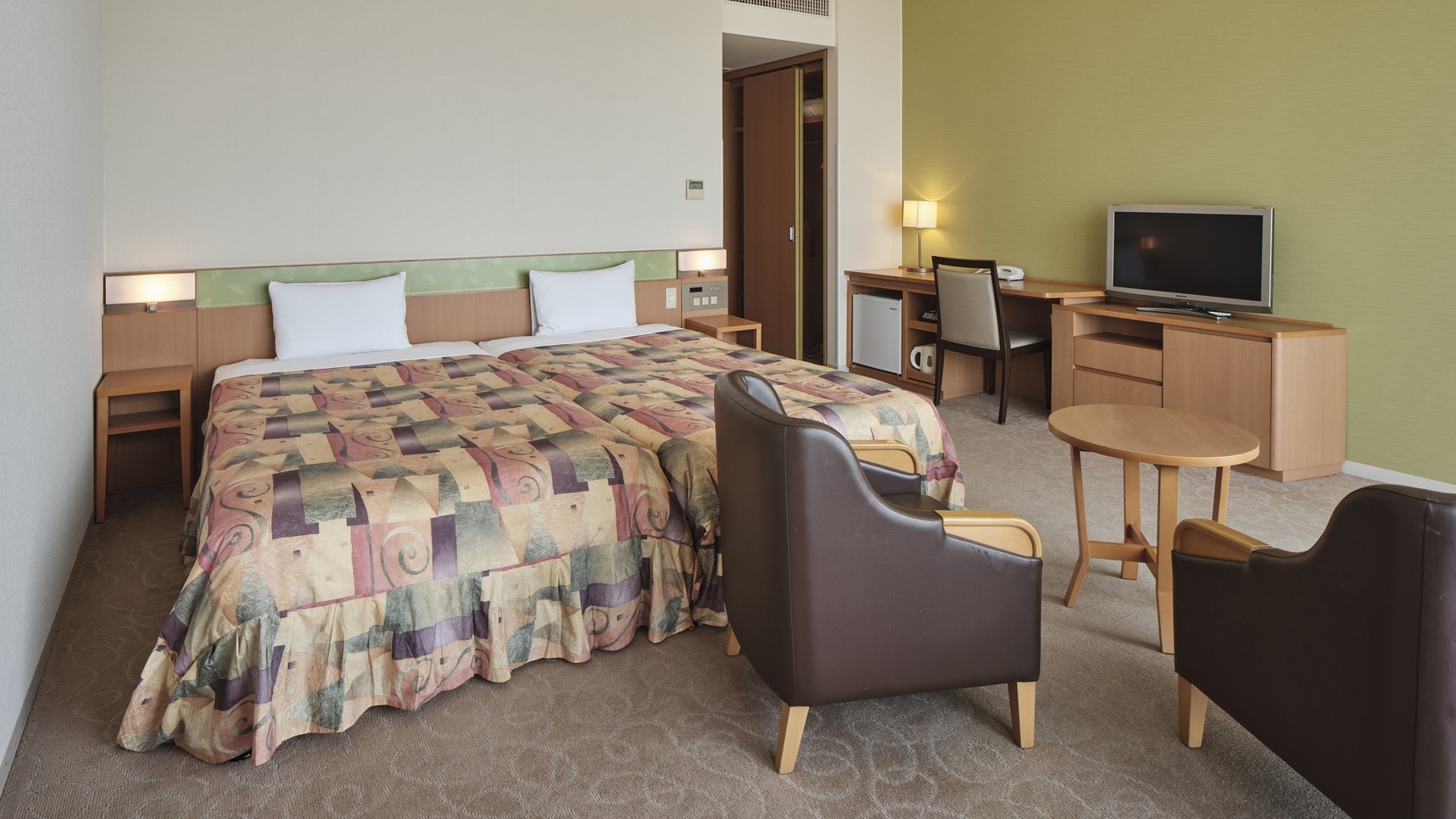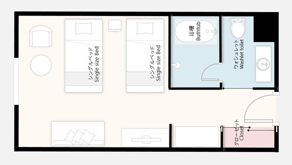 幅広い用途でお泊りいただける、低層階に位置する洋室です。※お風呂はユニットバスです。※3名以上の場合はエキストラベッドもしくはソファベッドが追加