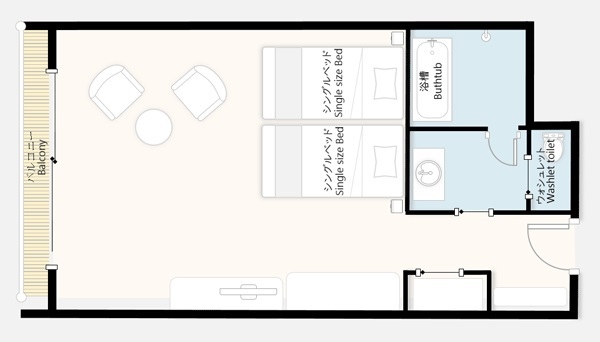 舞浜リゾートに面したバルコニー付き、約36平米のゆったりとした広さでのお部屋です。※3名以上の場合はエキストラベッド追加