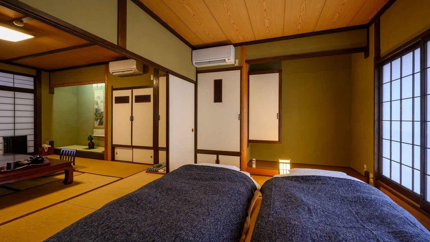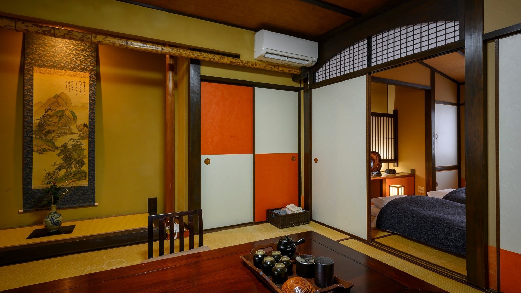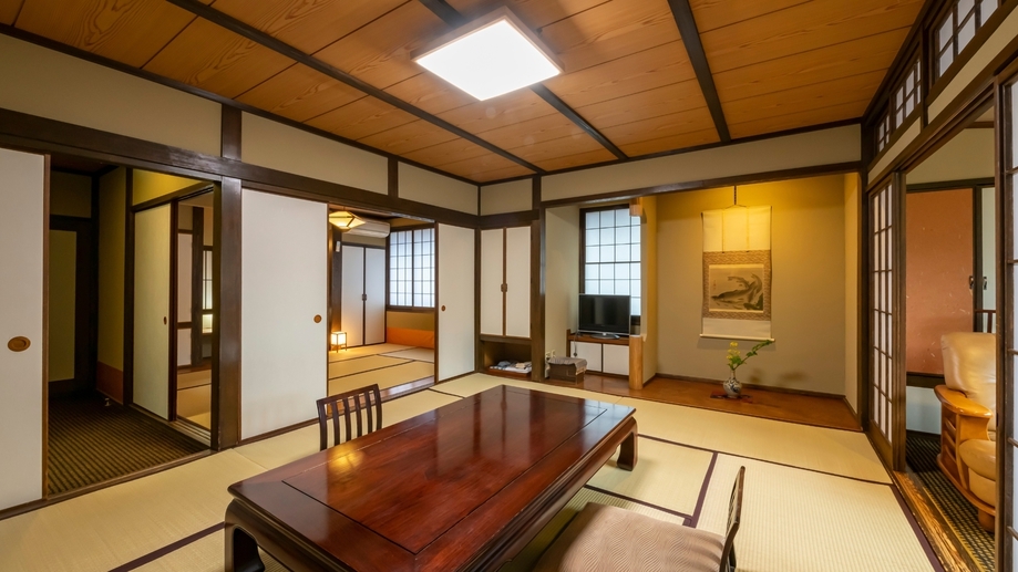 落ち着いた色調と伝統的な設えが魅力のお部屋です。 本間、次の間の二部屋のゆったりした空間に 和ベッドを備え、趣ある調度品が静かに彩りを添えます。