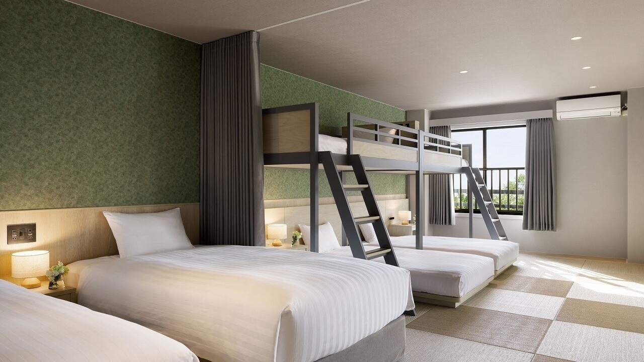 75平米、ベッド5台、TV、WiFi、冷蔵庫、ケトル、バスタブ&シャワー、ヘアドライヤーを完備。お子様添い寝は2名まで