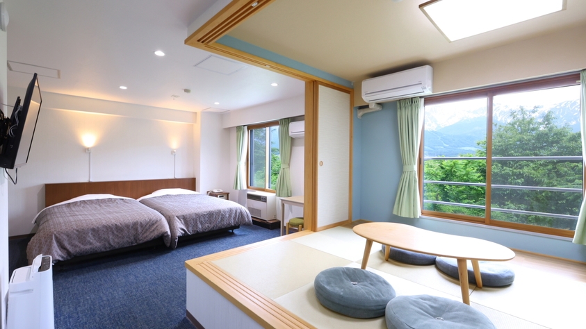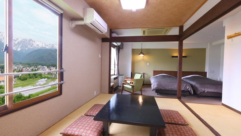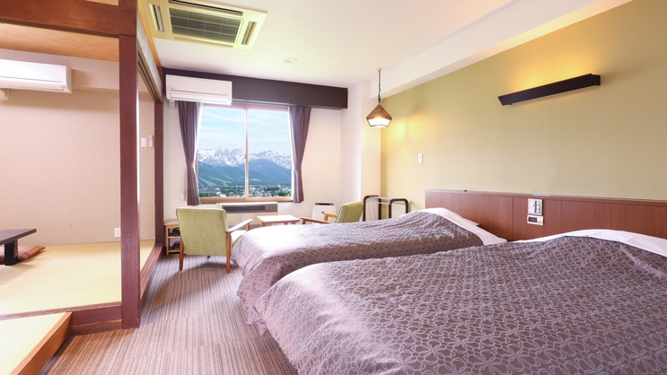 北アルプス連峰を一望するダイナミックな風景と共に、ゆっくりお寛ぎください■約40平米■バス・トイレ・洗面は独立型■ベッド幅115cm×2台 お布団3組