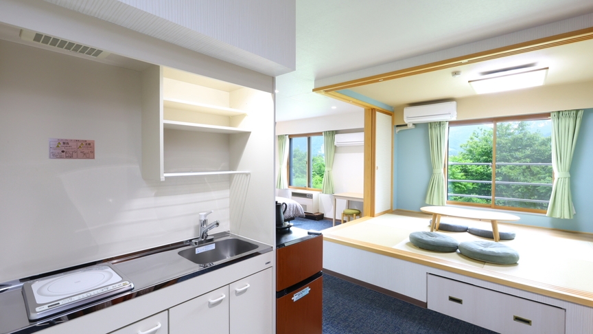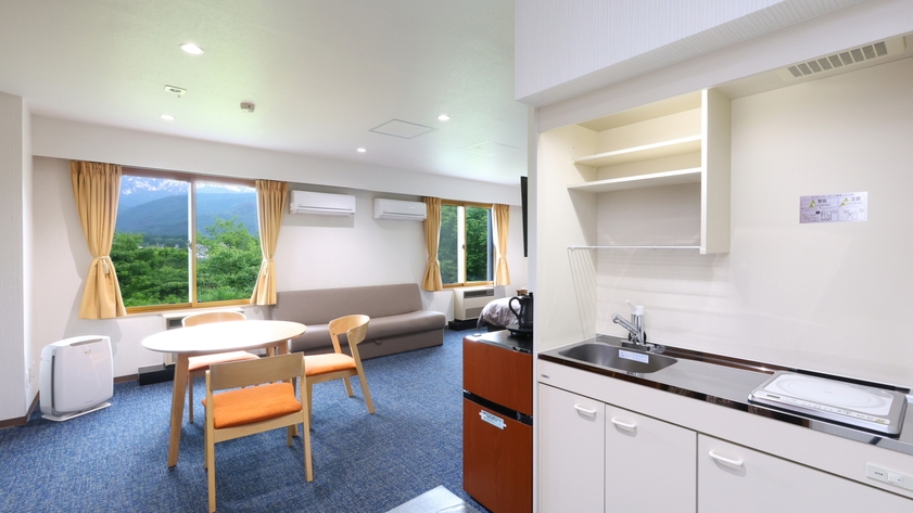 すべてのお客様が安心してお過ごしいただけるユニバーサルデザイン洋室です■シャワーブース・ミニキッチン■ベッド195cm×115cm 2台/ソファベッド1台