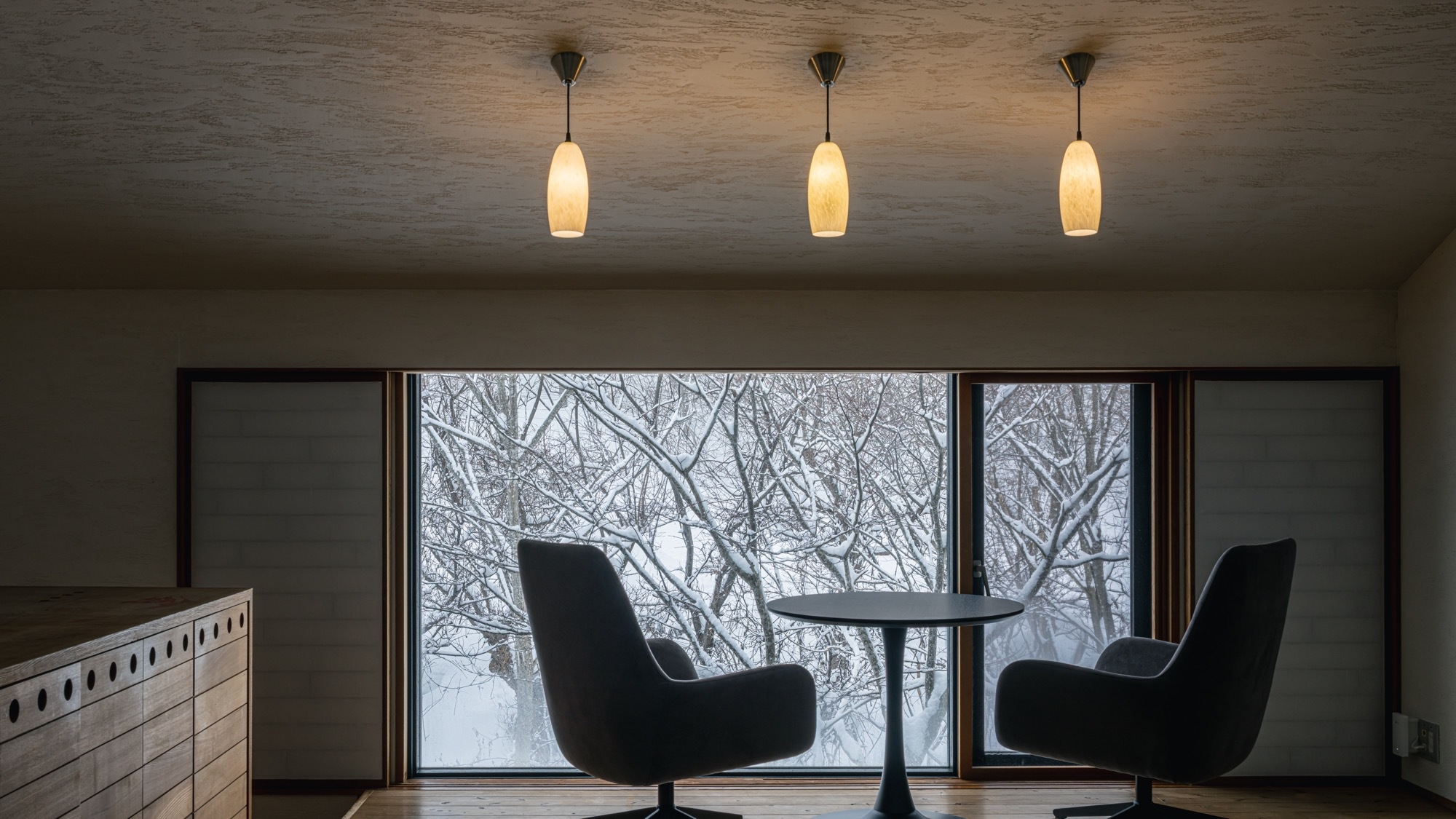 各室には異なる素材とデザインを施し、窓辺には里山の景色を取り込んだ意匠を配しています。