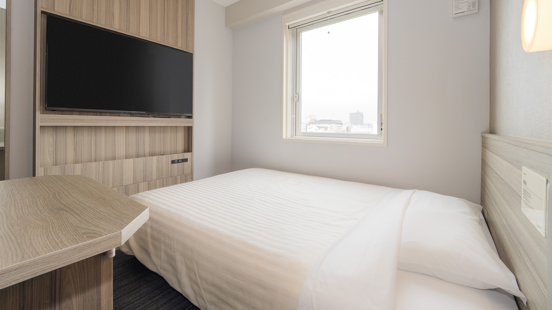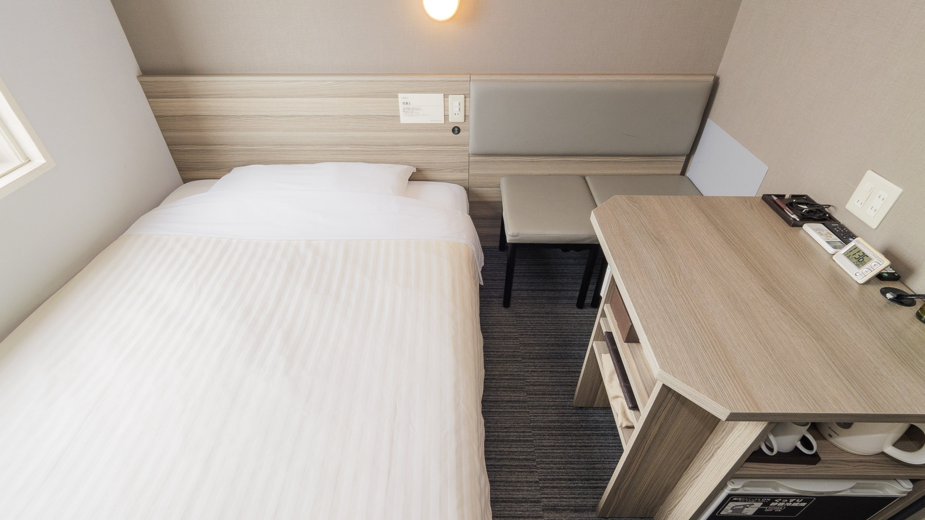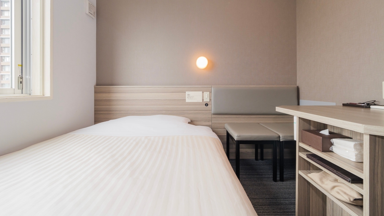 140cm幅のワイドベッド+横70cm奥行80cmデスクの【エクストラルーム】です。 デスクで仕事や作業がしやすいお部屋です。