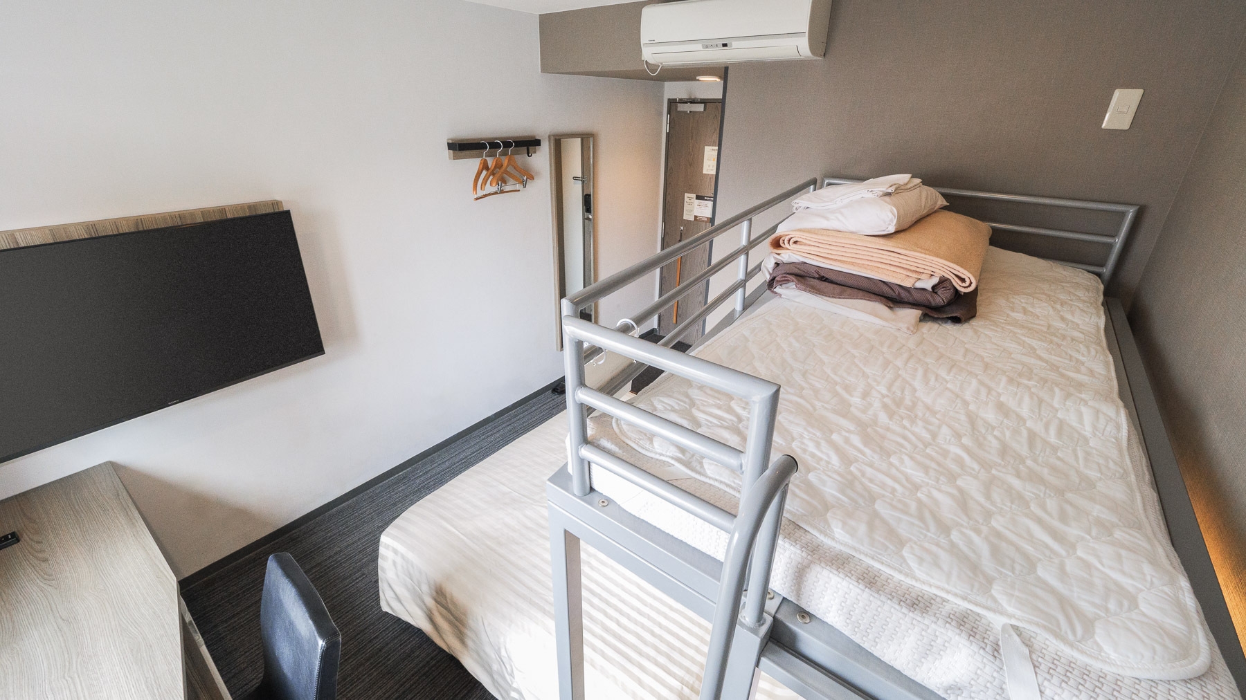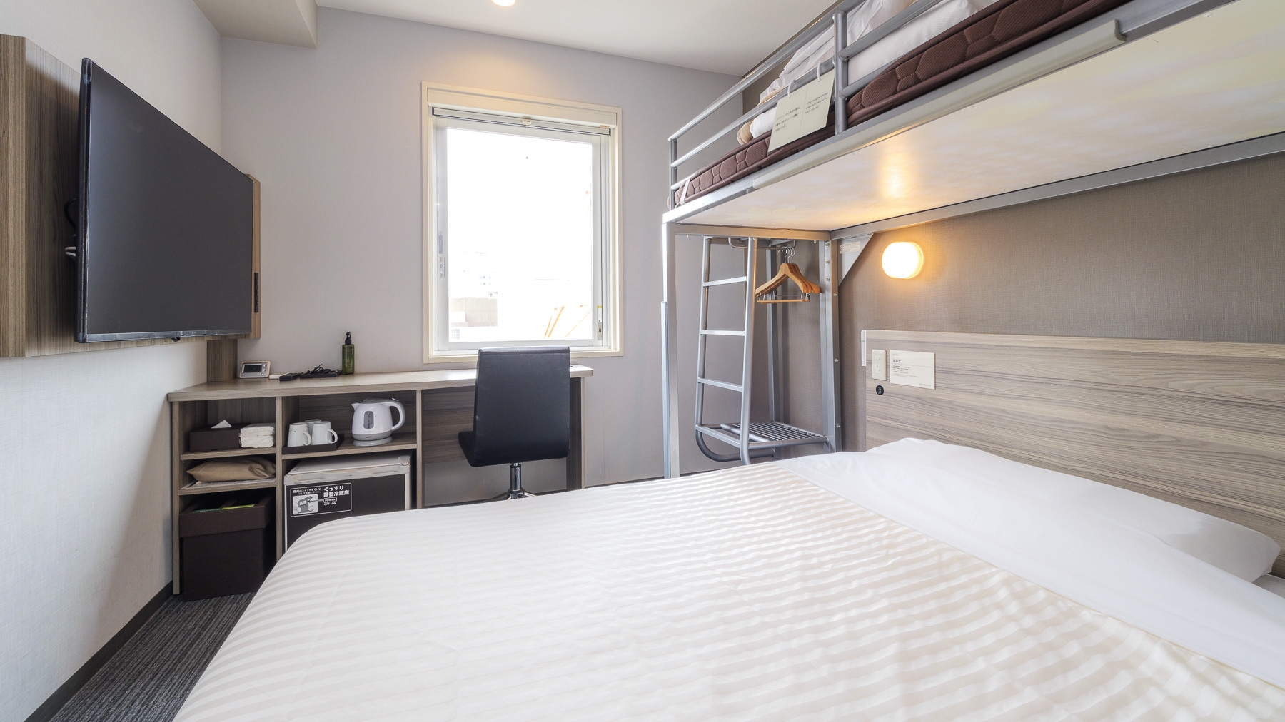 ダブルサイズのワイドベッドとお子様に人気のロフトベッド付の【スーパールーム】です。 ご家族にお勧めです。