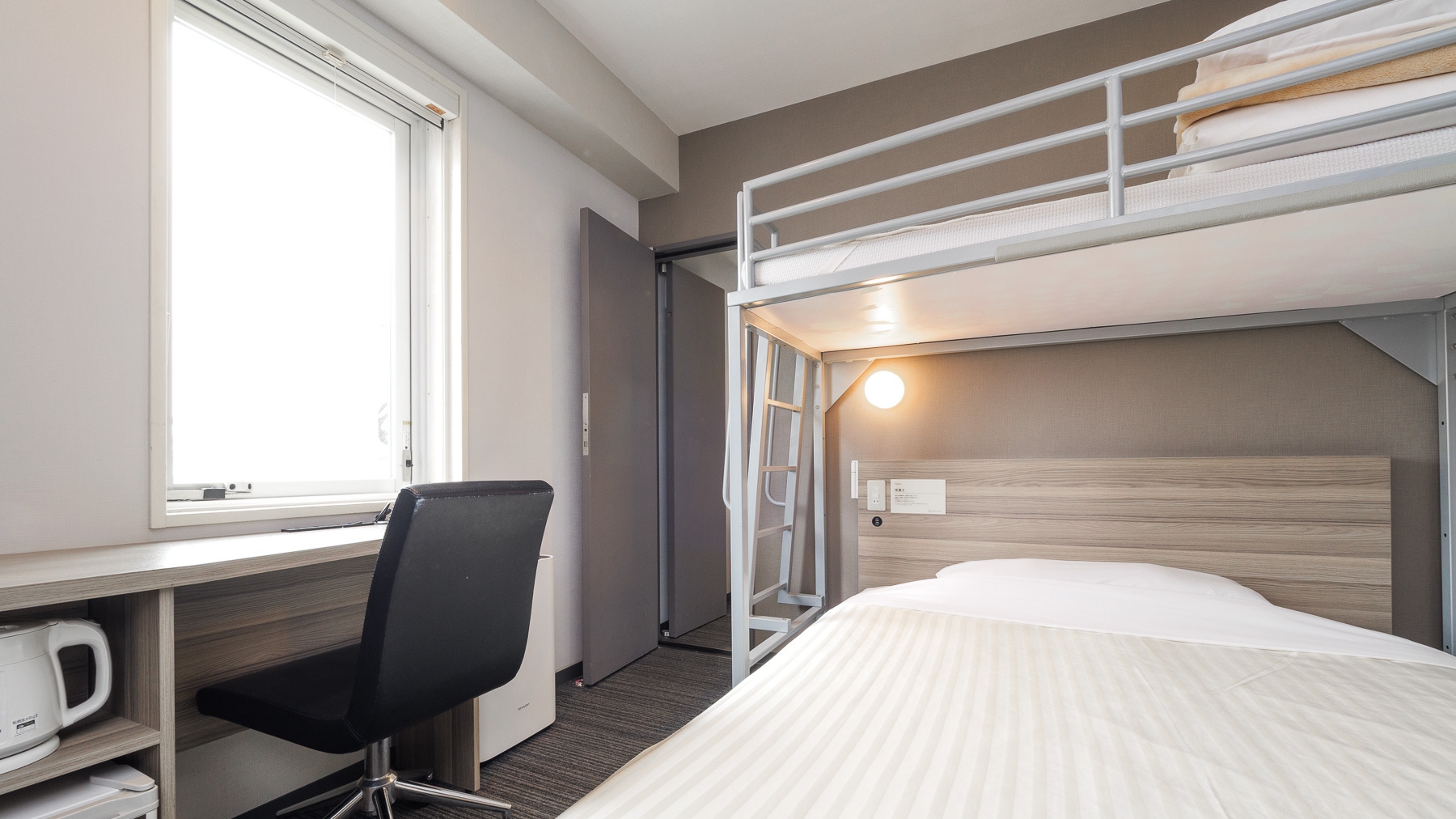 ダブルサイズのワイドベッドとお子様に人気のロフトベッド付のスーパールームが2部屋繋がった【スーパールームコネクティング】です。
