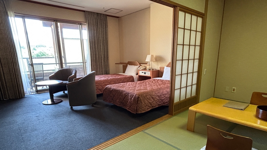 和室とセミダブルベッドを2台備えた洋室の広々二間の客室です。和の情緒を感じつつベッドでお休みになりたい方にオススメです。