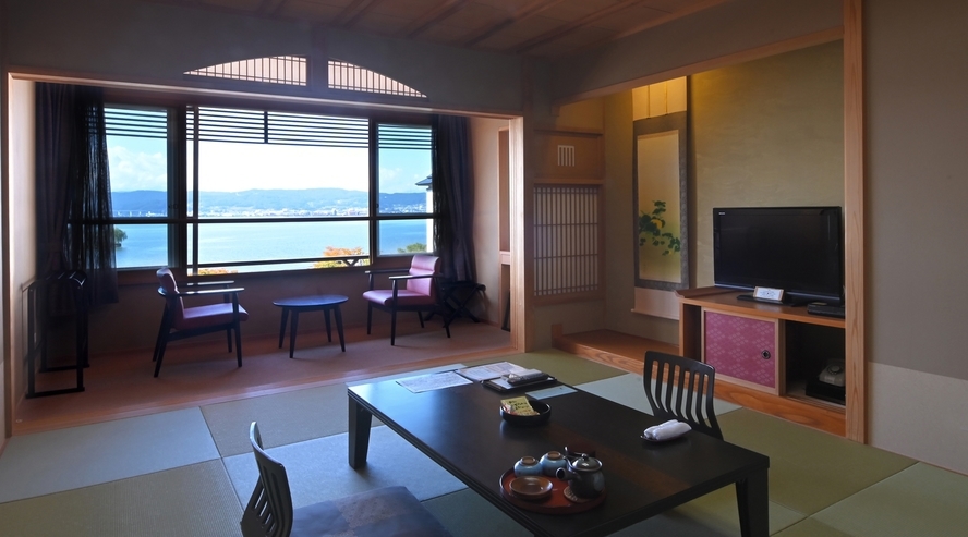 【本館湖側】11畳+6畳、二間続きの和室。最大7名様までご利用可能。お部屋から諏訪湖がご覧いただけます>グループ旅行や三世代旅行におすすめです。