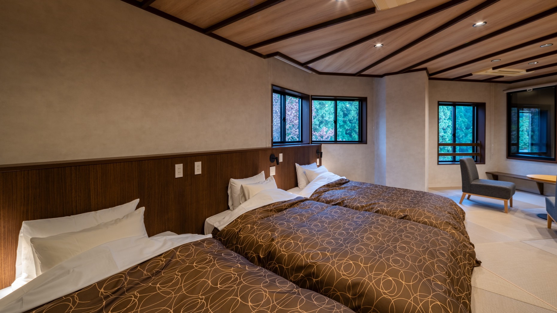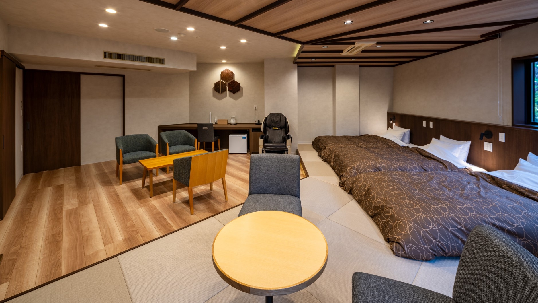 2025.1リニューアル/檜風呂・サウナ/シモンズ製セミダブルベッド3台/マッサージチェア/冷暖房/薄型TV/空冷蔵庫/Wi-Fi/独立洗面・シャワートイレ