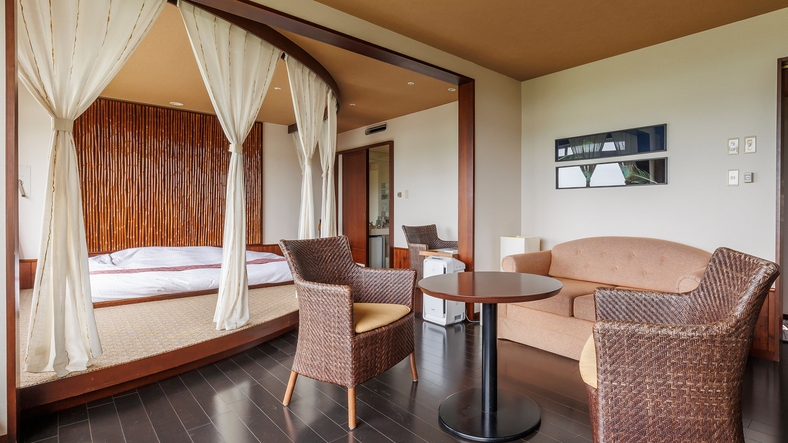 様々な用途で使える琉球畳の広々和洋室/ワイドシングル(110cm幅)×2台/リビングスペース有/47平米/ユニットバス・洗浄機付トイレ/無料WI-Fi