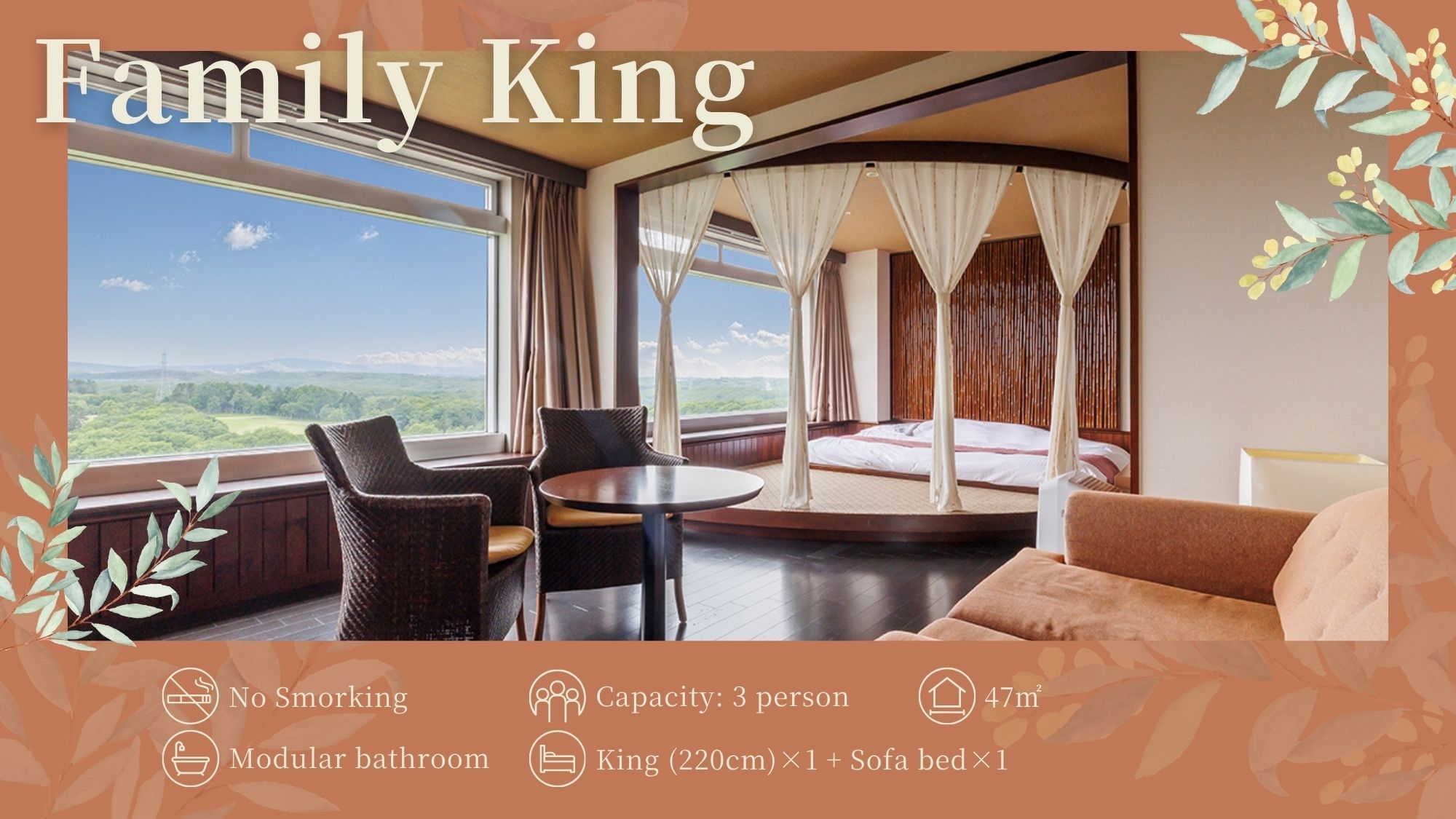 3室のみの特別仕様客室/上層階/キング(220cm幅)×1台/ソファベッド/リビングルーム有/47平米/ユニットバス・洗浄機付トイレ/無料WI-Fi
