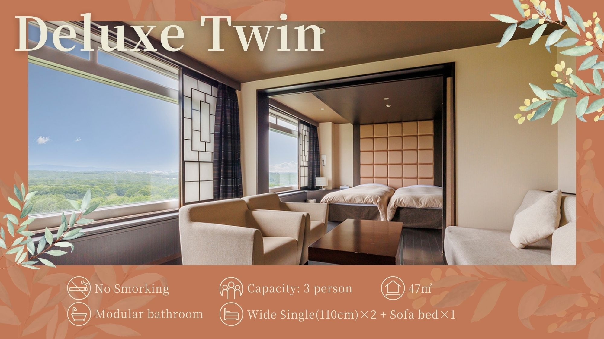 3室のみの特別仕様客室/上層階/シングル(110cm幅)×2/リビングルーム/47平米/ユニットバス・洗浄機付トイレ/無料WI-Fi有
