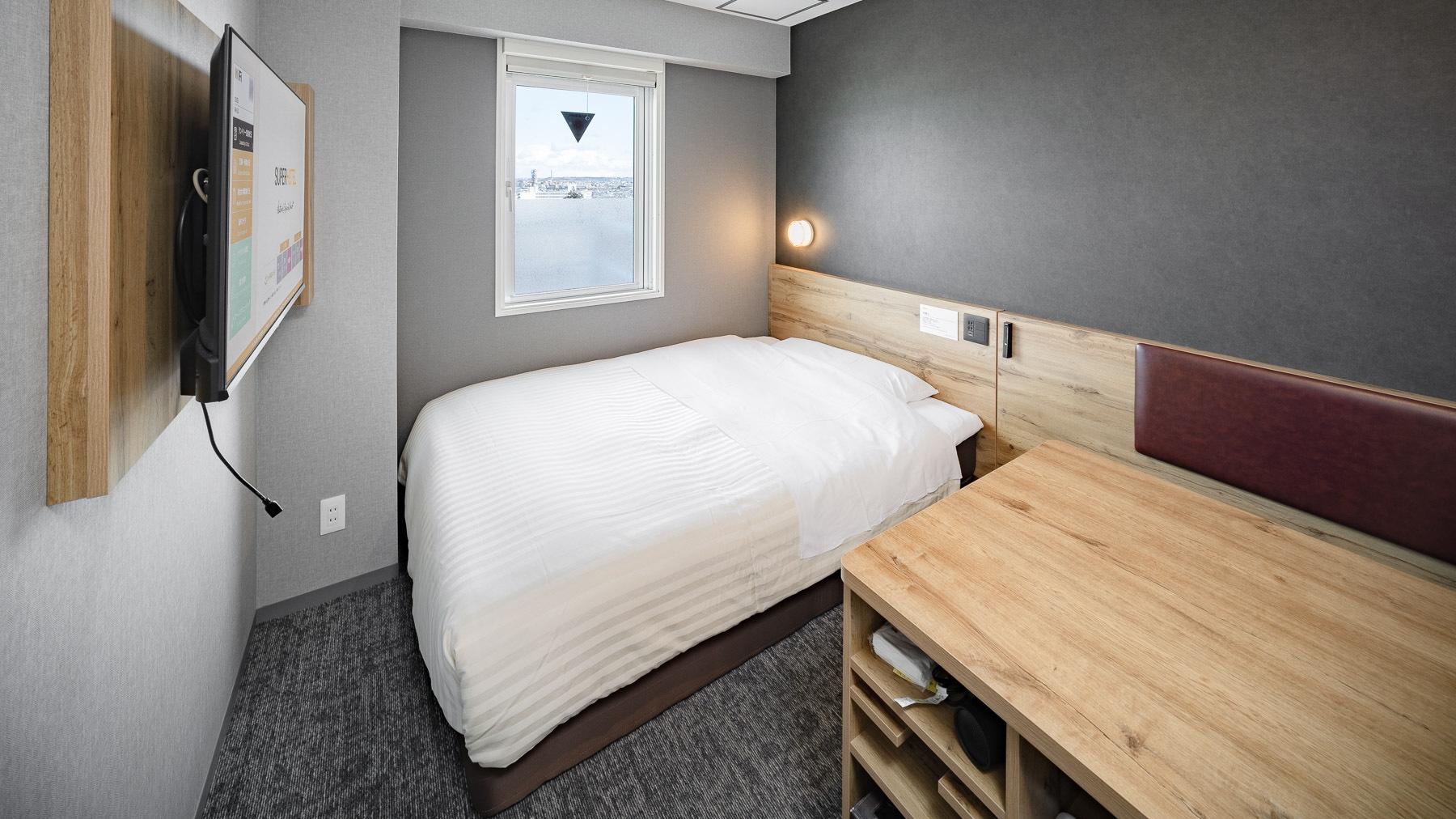 スーパーホテルで最もスタンダードなお部屋である【スタンダードルーム】です。 150cm幅のダブルサイズのワイドベッドでぐっすりお休み下さい。