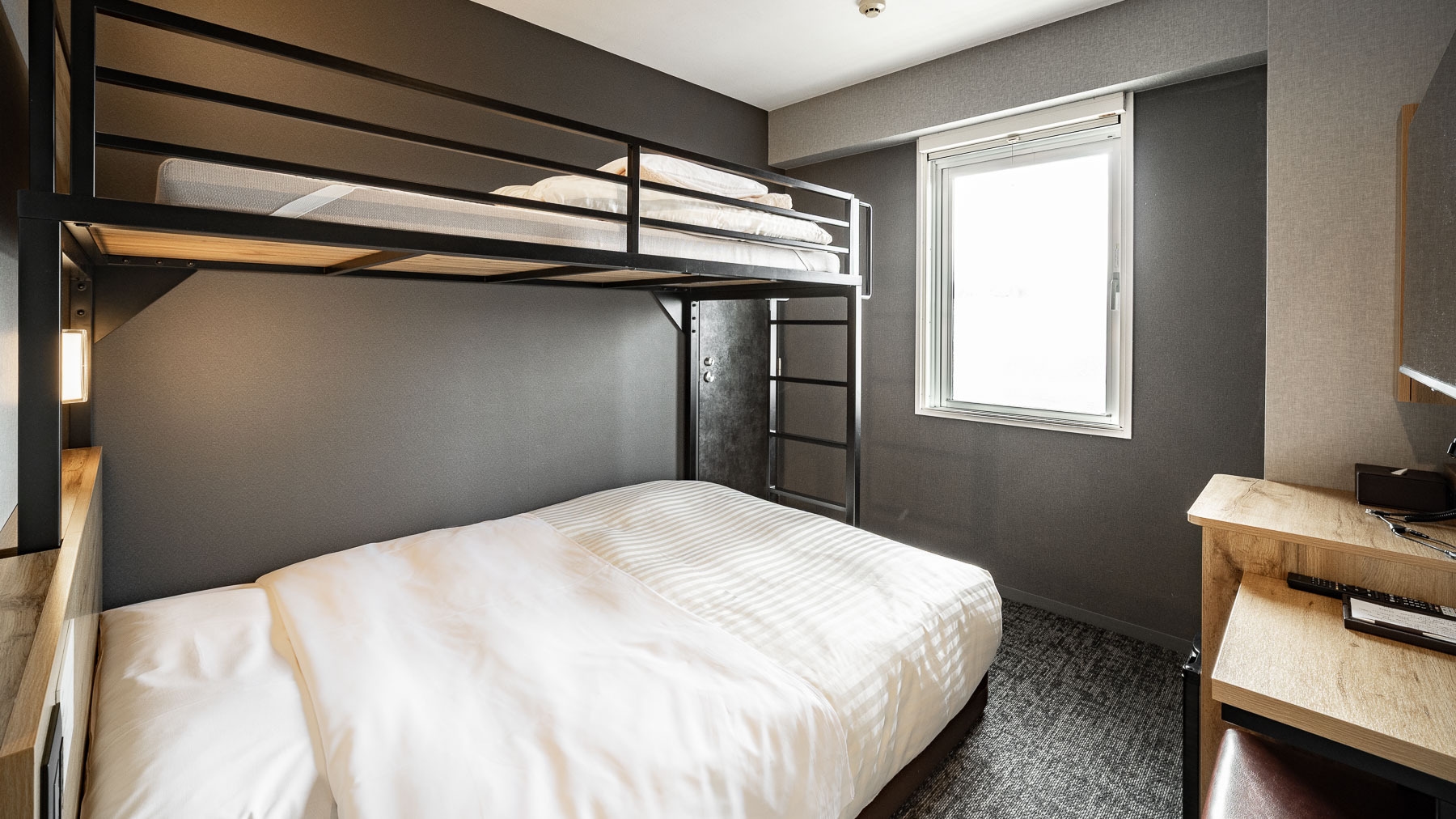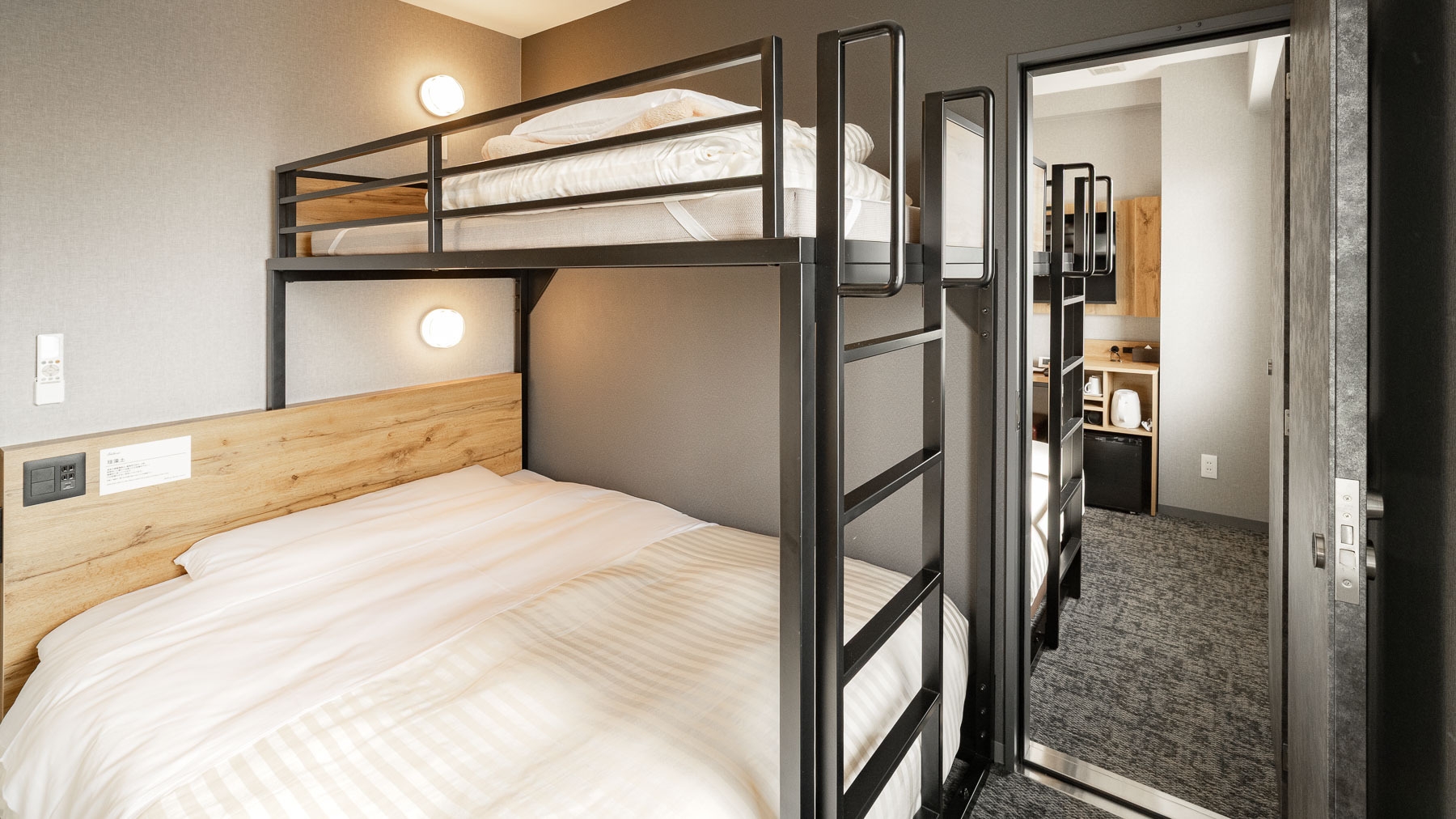 ダブルサイズのワイドベッドとお子様に人気のロフトベッド付のスーパールームが2部屋繋がった【スーパールームコネクティング】です。