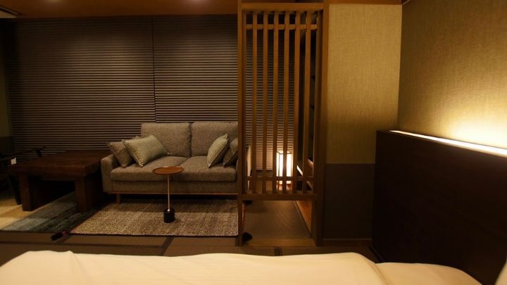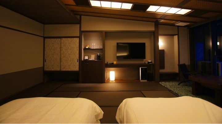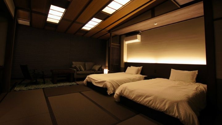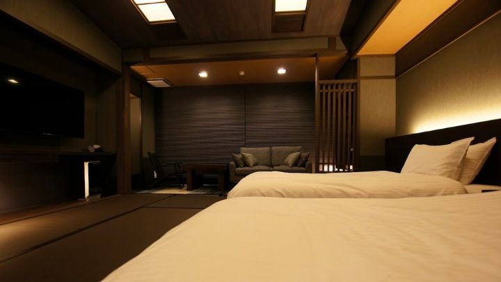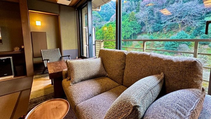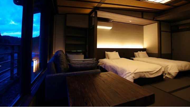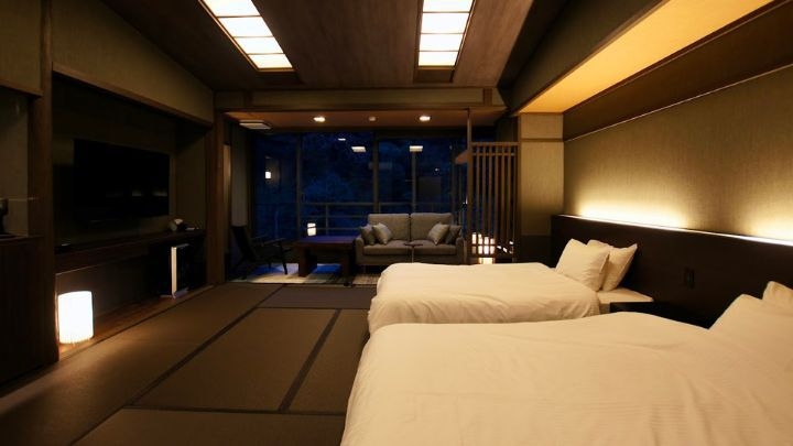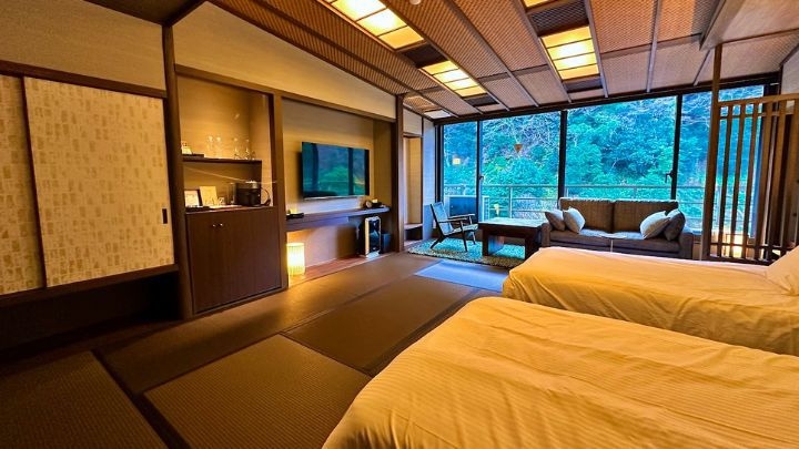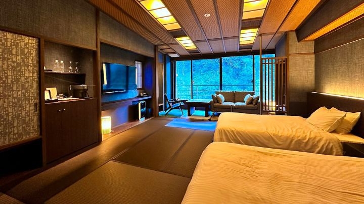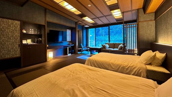 【渓谷に寄り添うラグジュアリースイート/2023年New】シモンズ製マットレスツイン+ソファベッド2台/露天風呂/リビングルーム/ベッドルーム/シャワーブース