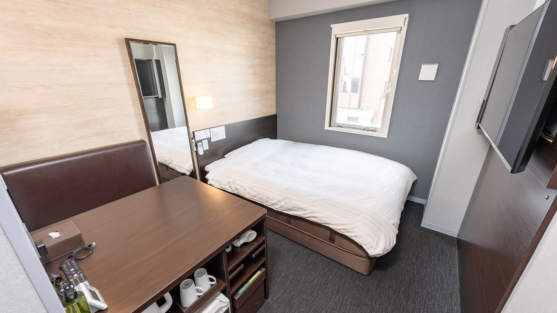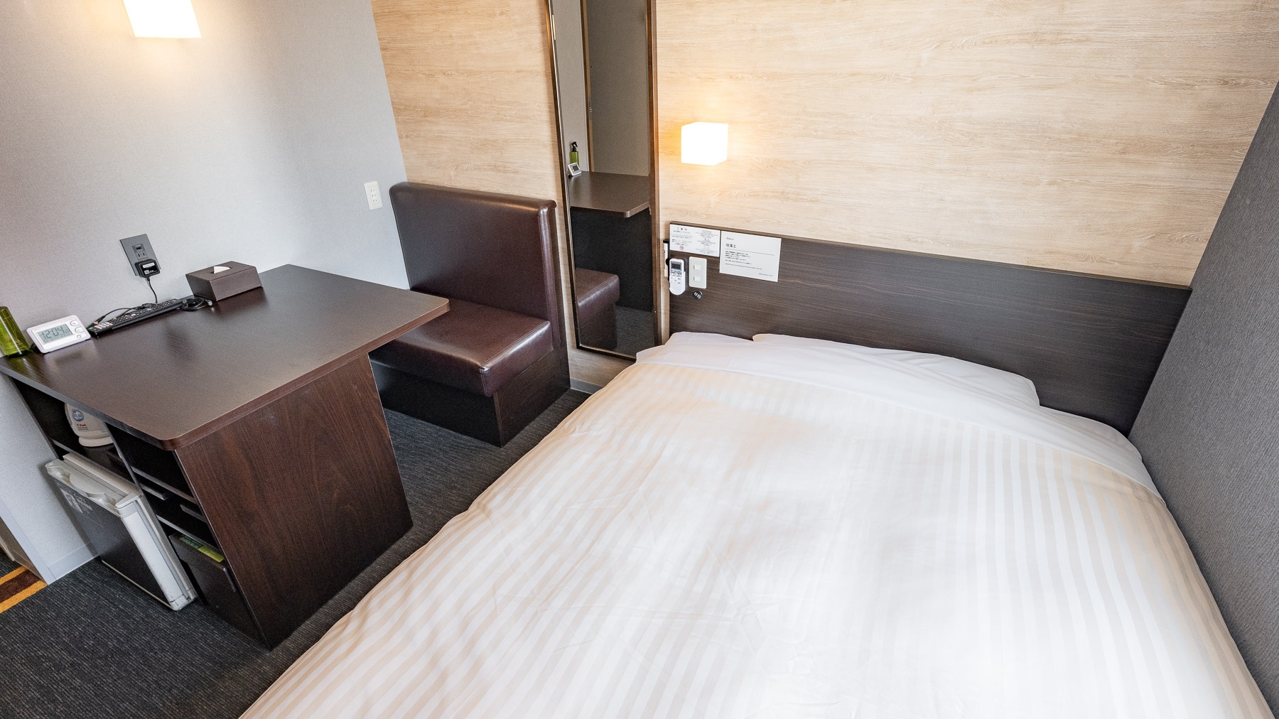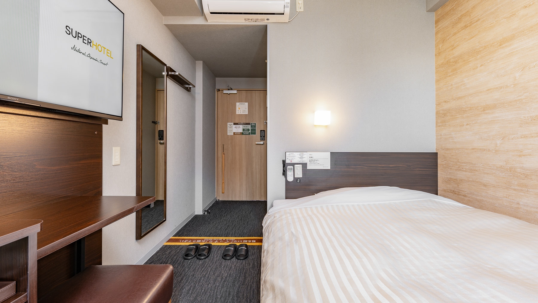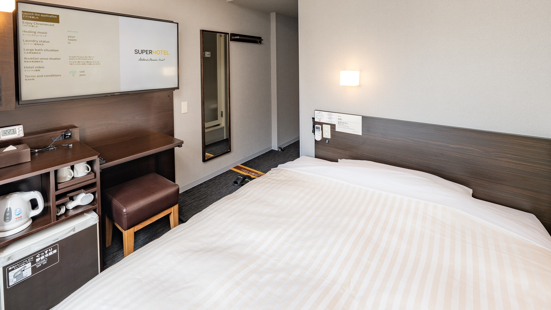 スーパーホテルで最もスタンダードなお部屋である【スタンダードルーム】です。150cm幅のダブルサイズのワイドベッドでぐっすりお休み下さい。