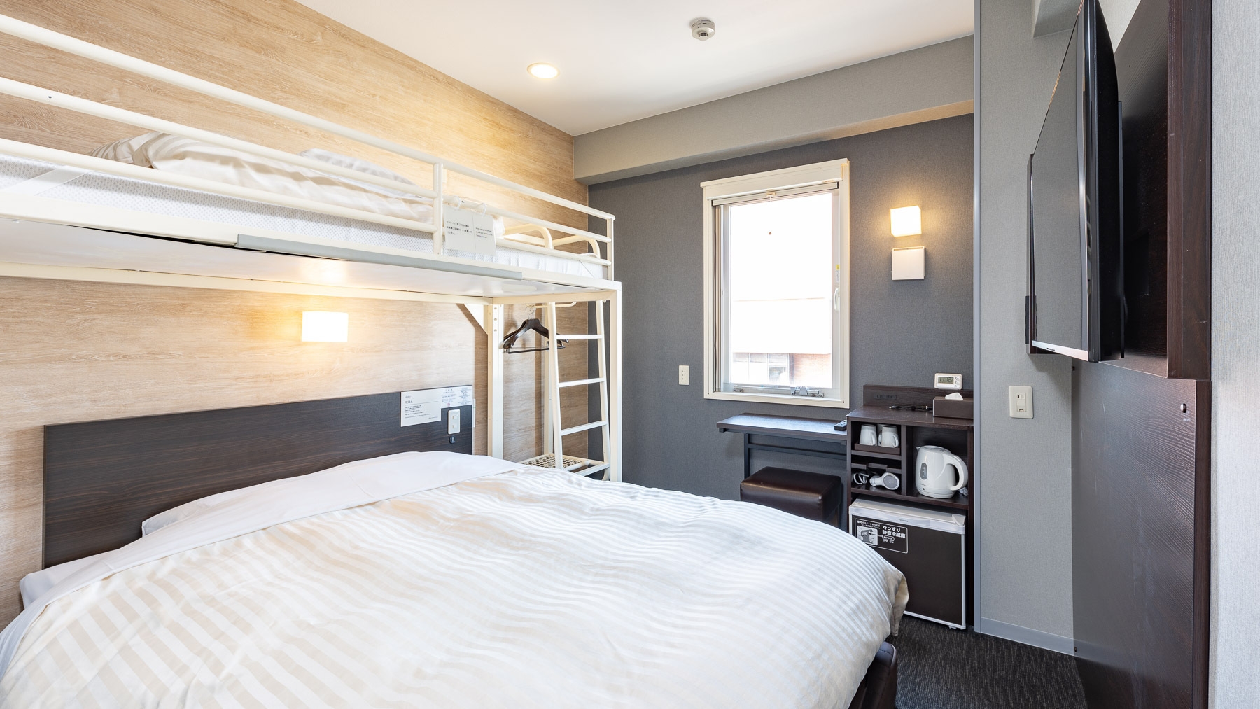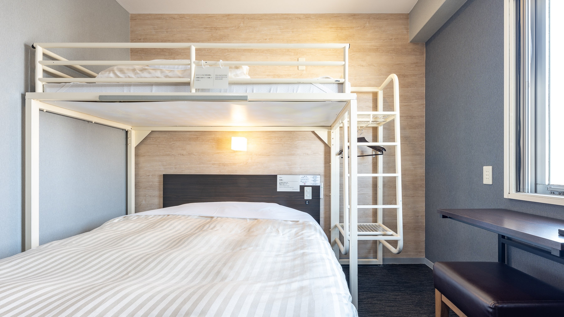 ダブルサイズのワイドベッドとお子様に人気のロフトベッド付の【スーパールーム】です。ご家族にお勧めです。